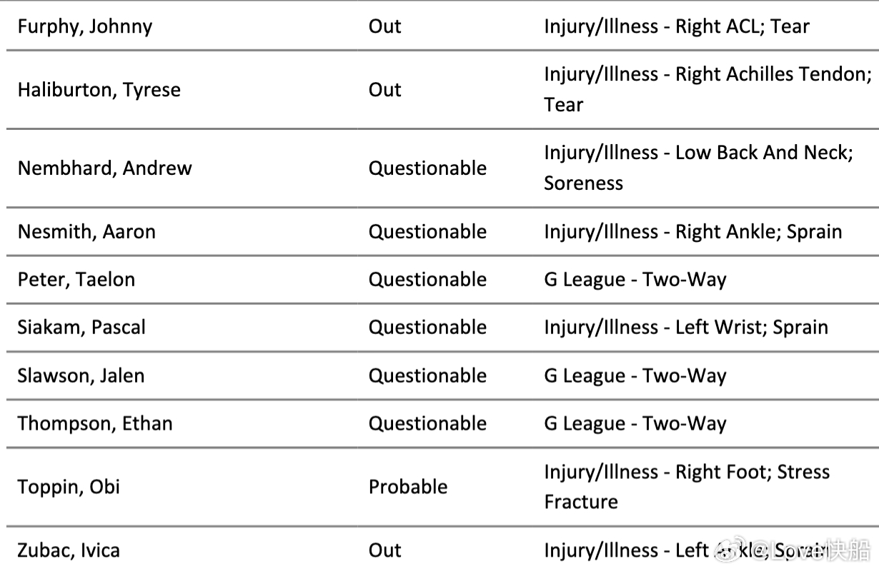 步行者明天对阵快船的伤病报告,很多人都是出战成疑,另外重返快船主场的祖巴茨确定不