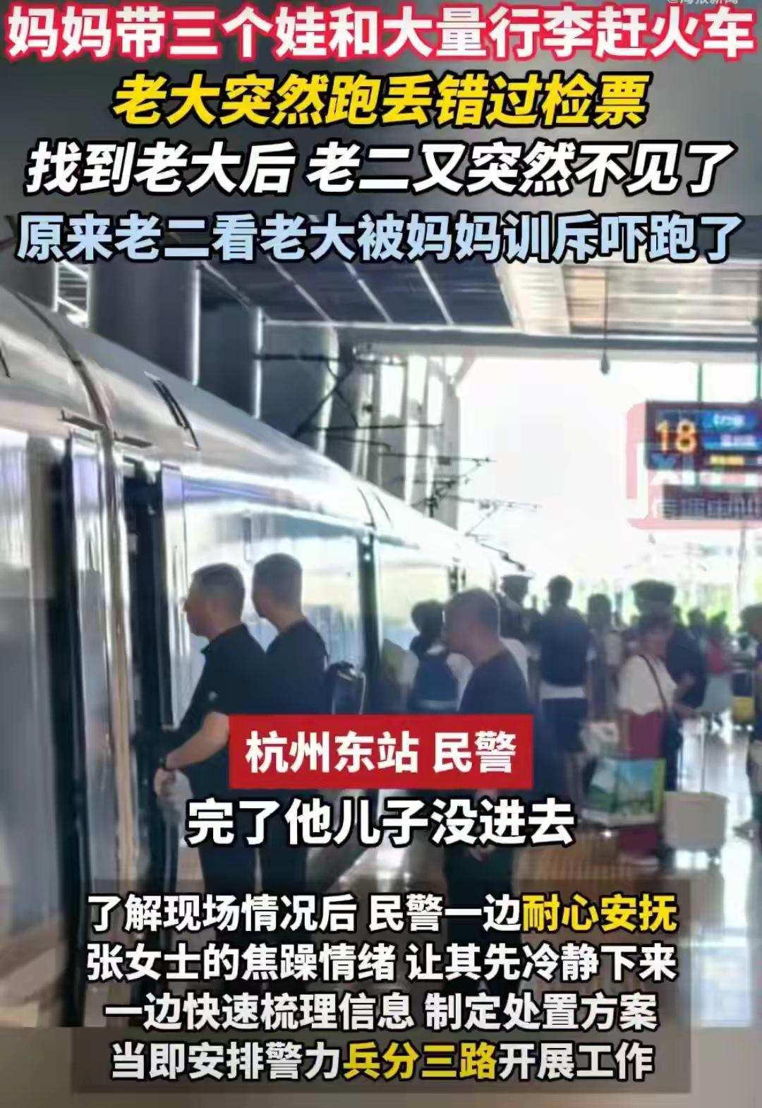 心疼!三胎妈妈带娃赶火车接连丢两娃被骂?听完原因鼻子一酸! 临近春节,张女士独自带着7岁大儿子、4岁小女儿和婴儿在杭州东站候车,检票前发现大儿子走失,她带着两个孩子找到在零食店的大儿子,却因此错过火车。 焦急的张女士情绪崩溃训斥儿子,引来民警调解,不料此时4岁小女儿又不见了。 民警兵分三路寻找,最终在服务台附近找到躲藏的小女孩,孩子称因害怕妈妈训斥哥哥才躲起来。 万幸孩子平安,民警协助张女士改签车票,并叮嘱其注意出行安全。 带娃坐火车,本就紧张又辛苦,何况是一个女人带三个娃! 不少人说这女人心真大,没有一点安全防患意识! 其实,哪一个女人愿意一拖三出门,肯定是无奈之举! 我倒是想问问,那个缺席的爹在哪?高速丢娃 带娃坐火车
