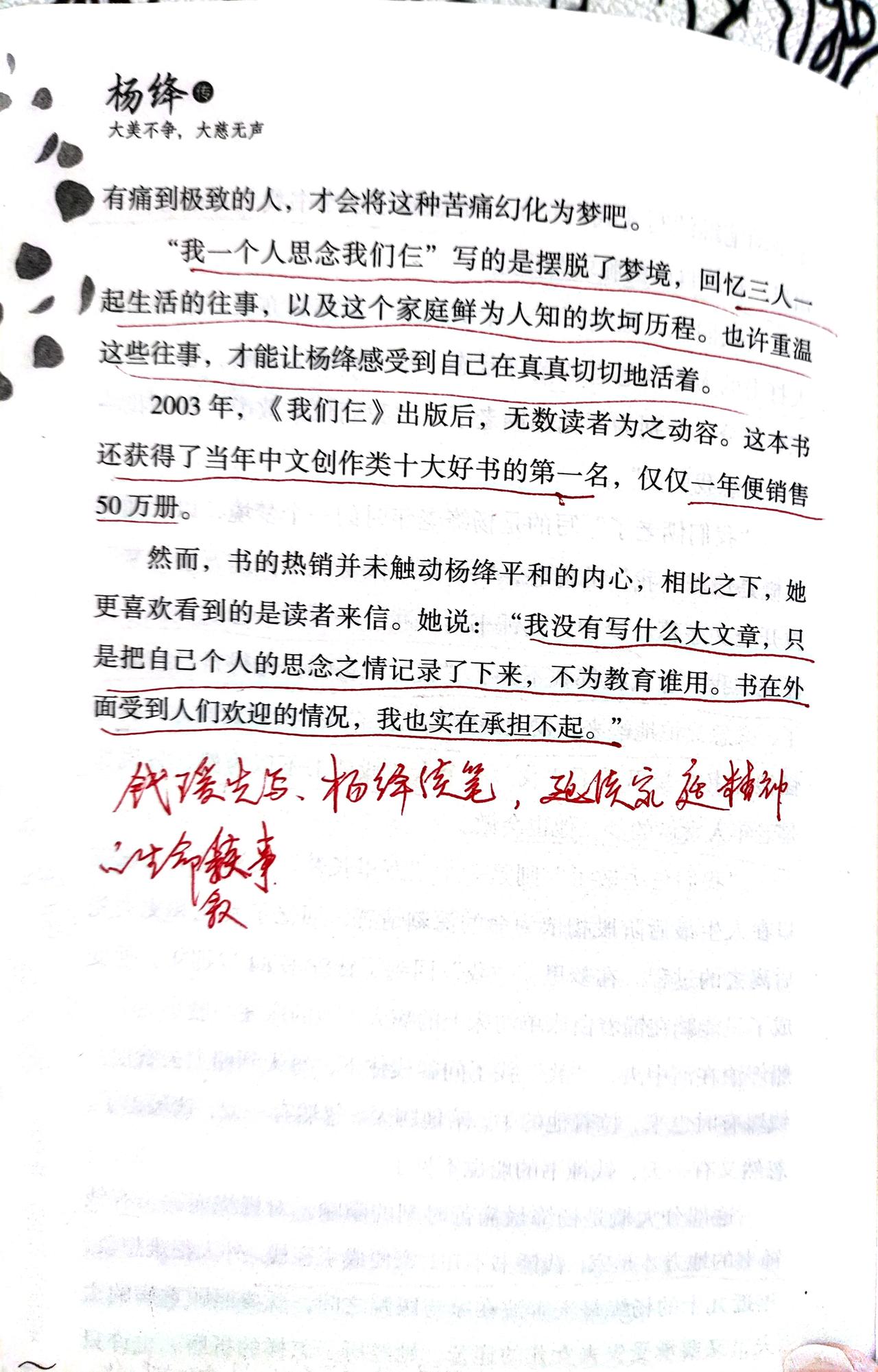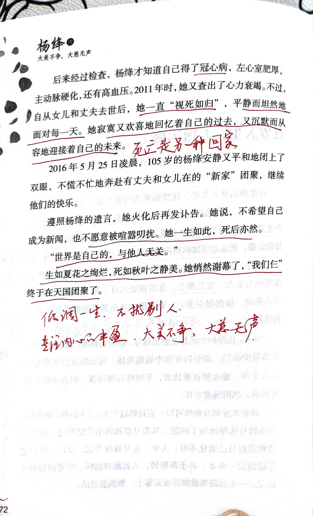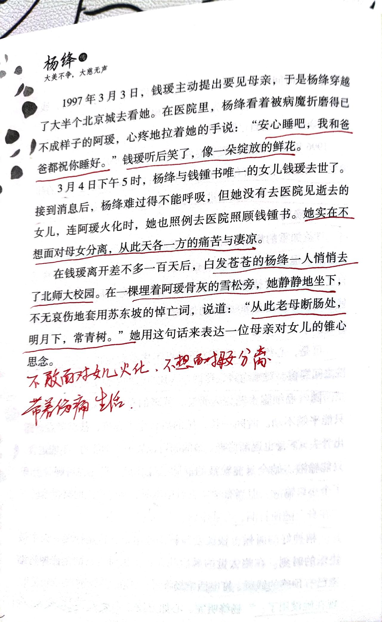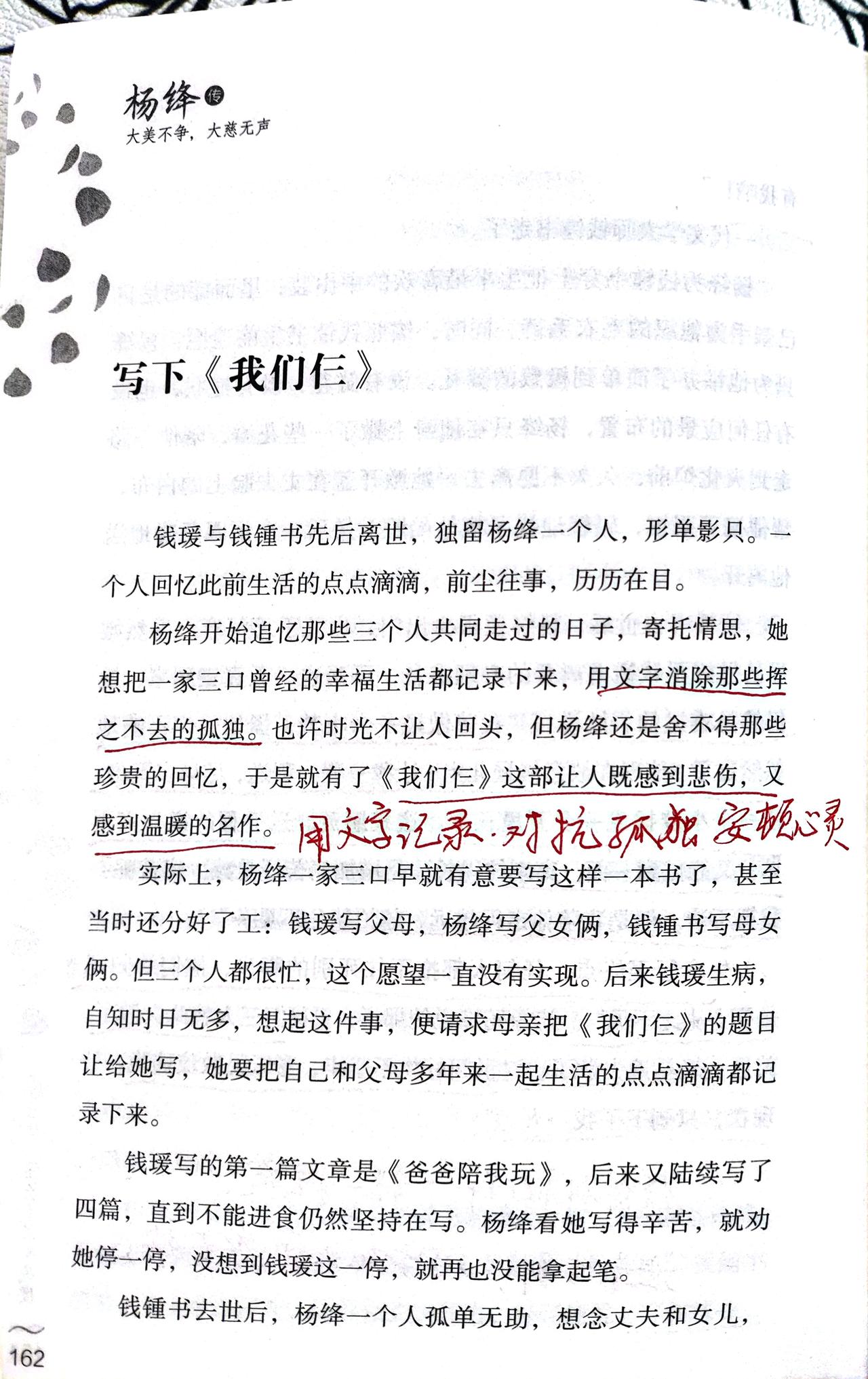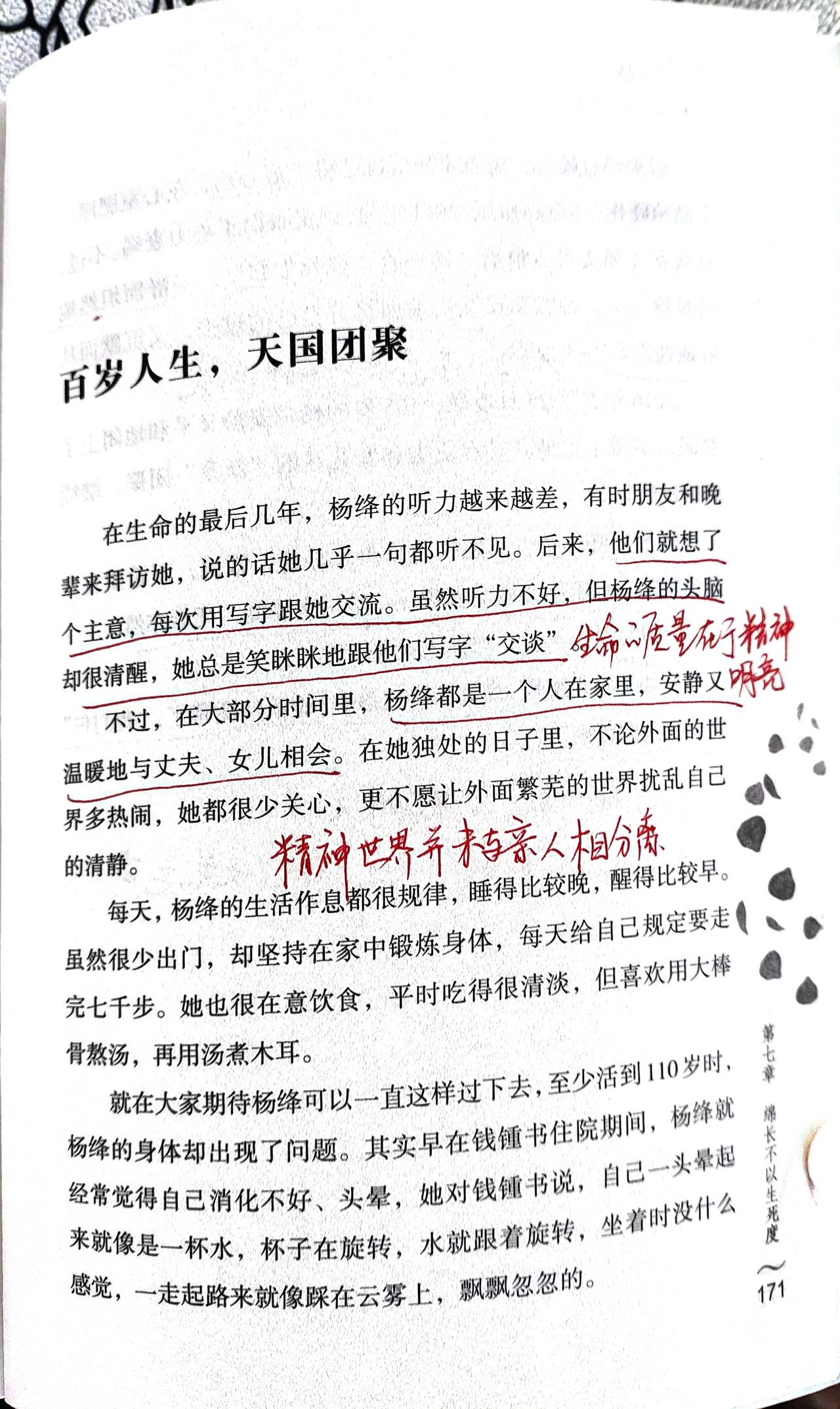 绵长不以生死度 做一个有趣的人,就算独处也不会感到寂寞。人的一生很长,人的一生又很短。 杨绛105岁高龄,年轻时告别父母,老年送走女儿和丈夫。绵长不以生死度,被留在人间的杨绛,将失去转换为永恒的文字,证明生命的长度不在于时间,而在于精神的延续。 女儿钱瑗出生在抗战时期,物质条件极差,所以身体素质一直不太好。抗战结束后,又患上了骨结核,学龄前几乎在病榻上度过。 1996年钱瑗不仅肺部出现了问题,颈椎也发生了病变。而这时候杨绛已经80多岁,钱钟书也病倒了。 杨绛不得不在女儿和丈夫所在的医院之间穿梭。钱瑗心疼母亲辛苦,就总是报喜不报忧,每一次见面都硬撑着。精神好的时候,钱瑗就和杨绛通电话,要她保重身体。 97年3月3日,钱瑗主动提出要见母亲。杨绛穿越大半个北京城,去看女儿,钱瑗说:娘您从前有一个女儿,现在她没用了。杨绛心疼的拉着女儿的手说,安心的睡吧,我和爸爸都祝你睡好。 没想到第2天,钱瑗就永远睡着了。白发人送黑发人的痛苦,只有当事人才知道。 钱瑗永远离开了,白发苍苍的杨绛一人悄悄的在北师大校园埋着钱瑗骨灰的雪松旁,静静的坐下说:从此老母肠断处,月明下常青树。 女儿去世以后,钱钟书的身体也每况愈下。 1998年年底,钱仲书陷入昏迷。短暂的清醒之际,他对杨绛说:绛,好好的活。 12月19日,一代文学大师钱钟书走了。 杨绛替他盖上白布,摘下眼镜,轻轻地擦拭他的脸,最后泪眼朦胧的送他离别。生命行至终点,任何人也拖不住死别的脚步。 他们终归还是从此不见,杨绛说,我们三人就此失散了,就这么轻易的失散了。 钱钟书死后,杨绛就开始整理钱钟书的书稿:外文笔记有34,000页,中文笔记有3万多页,日札有2000多页。 杨绛耐着性子,一点点拼凑起来,仔细粘好,整理后再装订起来,还要从头到尾审阅一遍。终于编成了《钱钟书手稿集》出版。 杨绛一家三口早就有意写一本书记录共同生活的日子。钱瑗写父母杨绛写父女,钱锺书写母女。 钱瑗写的第1篇文章是《爸爸陪我玩》,后面陆续写了4篇,但因为身体原因没有写下去。杨绛用文字记录,对抗寂寞,安顿心灵,释放自己的思念,就开始继续写《我们仨》,2003年这本书成了当年中文创作类十大好书的第1名。2001年杨绛做了一个决定,设立了“好读书”奖励基金。 2016年5月,105岁的杨绛,安静平和的闭上了双眼,去天国与丈夫、女儿团聚了。