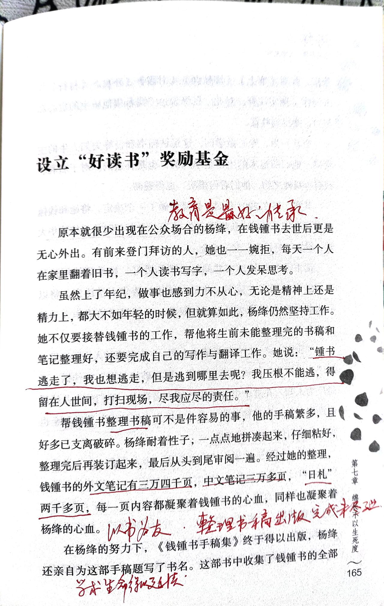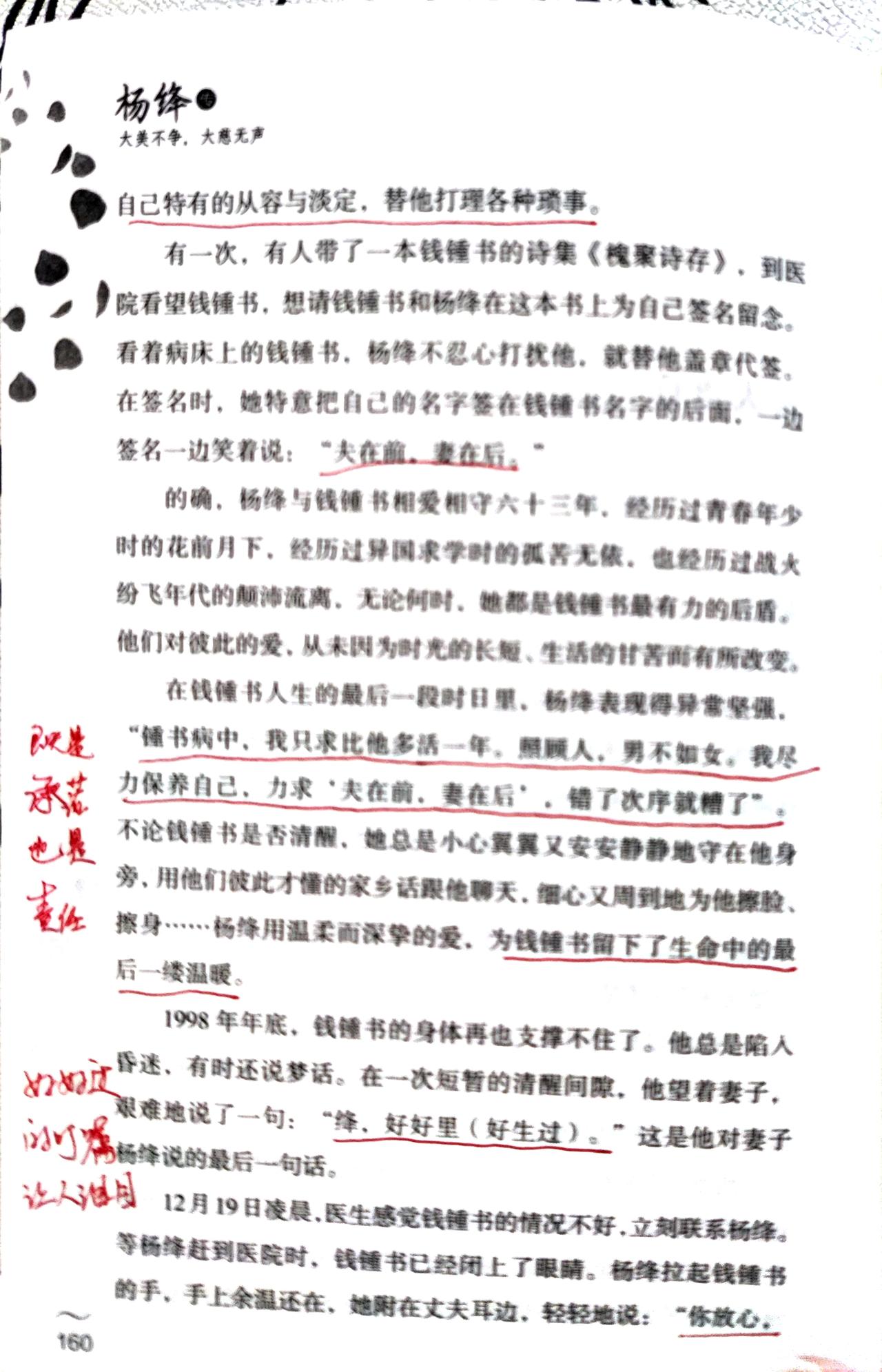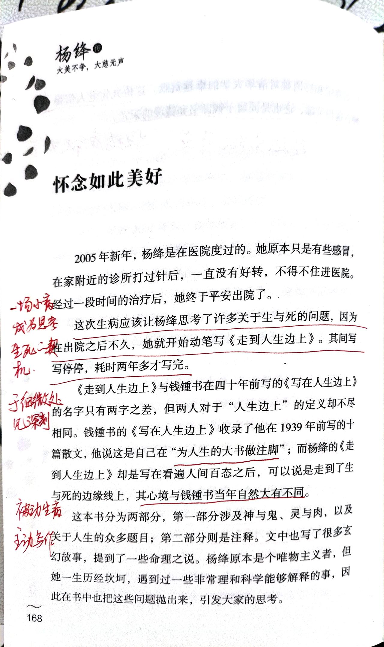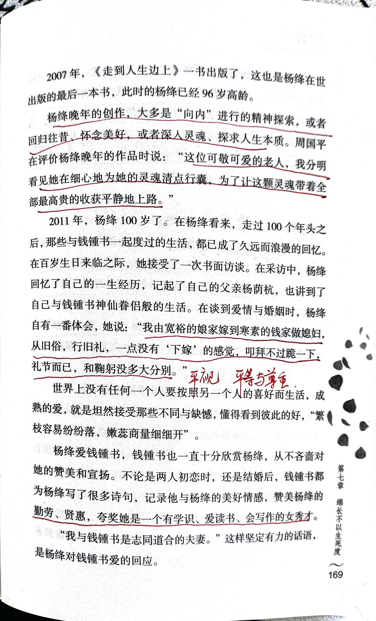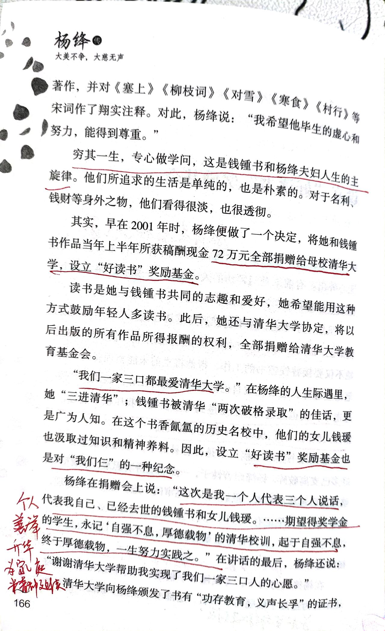 绵长不以生死度 做一个有趣的人,就算独处也不会感到寂寞。人的一生很长,人的一生又很短。 杨绛105岁高龄,年轻时告别父母,老年送走女儿和丈夫。绵长不以生死度,被留在人间的杨绛,将失去转换为永恒的文字,证明生命的长度不在于时间,而在于精神的延续。 女儿钱瑗出生在抗战时期,物质条件极差,所以身体素质一直不太好。抗战结束后,又患上了骨结核,学龄前几乎在病榻上度过。 1996年钱瑗不仅肺部出现了问题,颈椎也发生了病变。而这时候杨绛已经80多岁,钱钟书也病倒了。 杨绛不得不在女儿和丈夫所在的医院之间穿梭。钱瑗心疼母亲辛苦,就总是报喜不报忧,每一次见面都硬撑着。精神好的时候,钱瑗就和杨绛通电话,要她保重身体。 97年3月3日,钱瑗主动提出要见母亲。杨绛穿越大半个北京城,去看女儿,钱瑗说:娘您从前有一个女儿,现在她没用了。杨绛心疼的拉着女儿的手说,安心的睡吧,我和爸爸都祝你睡好。 没想到第2天,钱瑗就永远睡着了。白发人送黑发人的痛苦,只有当事人才知道。 钱瑗永远离开了,白发苍苍的杨绛一人悄悄的在北师大校园埋着钱瑗骨灰的雪松旁,静静的坐下说:从此老母肠断处,月明下常青树。 女儿去世以后,钱钟书的身体也每况愈下。 1998年年底,钱仲书陷入昏迷。短暂的清醒之际,他对杨绛说:绛,好好的活。 12月19日,一代文学大师钱钟书走了。 杨绛替他盖上白布,摘下眼镜,轻轻地擦拭他的脸,最后泪眼朦胧的送他离别。生命行至终点,任何人也拖不住死别的脚步。 他们终归还是从此不见,杨绛说,我们三人就此失散了,就这么轻易的失散了。 钱钟书死后,杨绛就开始整理钱钟书的书稿:外文笔记有34,000页,中文笔记有3万多页,日札有2000多页。 杨绛耐着性子,一点点拼凑起来,仔细粘好,整理后再装订起来,还要从头到尾审阅一遍。终于编成了《钱钟书手稿集》出版。 杨绛一家三口早就有意写一本书记录共同生活的日子。钱瑗写父母杨绛写父女,钱锺书写母女。 钱瑗写的第1篇文章是《爸爸陪我玩》,后面陆续写了4篇,但因为身体原因没有写下去。杨绛用文字记录,对抗寂寞,安顿心灵,释放自己的思念,就开始继续写《我们仨》,2003年这本书成了当年中文创作类十大好书的第1名。2001年杨绛做了一个决定,设立了“好读书”奖励基金。 2016年5月,105岁的杨绛,安静平和的闭上了双眼,去天国与丈夫、女儿团聚了。