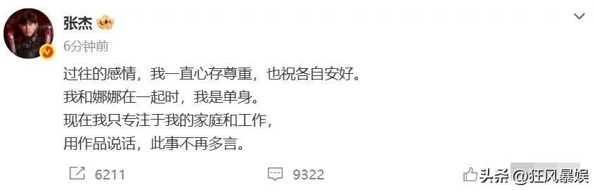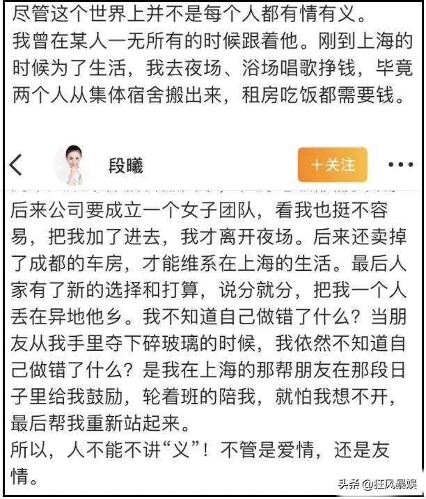 内娱乱成一锅粥了!张杰前女友段曦跳出来发长文,控诉张杰出轨,张杰很快回应了! 张杰前女友突然跳出来发长文控诉张杰出轨,大致意思是这样的: 段曦和张杰刚到上海时一无所有,段曦是在夜场,浴场唱歌挣钱生活的,就为了搬出集体宿舍,租房和张杰住一起。也就是说张杰是靠着前女友夜场挣钱生活的。 后来,张杰说为了更好的发展,单方面分手,把前女友一个人留在了异乡,为此段曦说到现在她都不明白,当时她做错了什么,后来是公司帮忙,让她加入了一个女团。 随后,张杰发文回应: 过往的感情,我一直心存尊重,望各自安好。 我和娜娜在一起时,我是单身, 现在我只专注于我的家庭和工作, 用作品说话,此事不再多言。