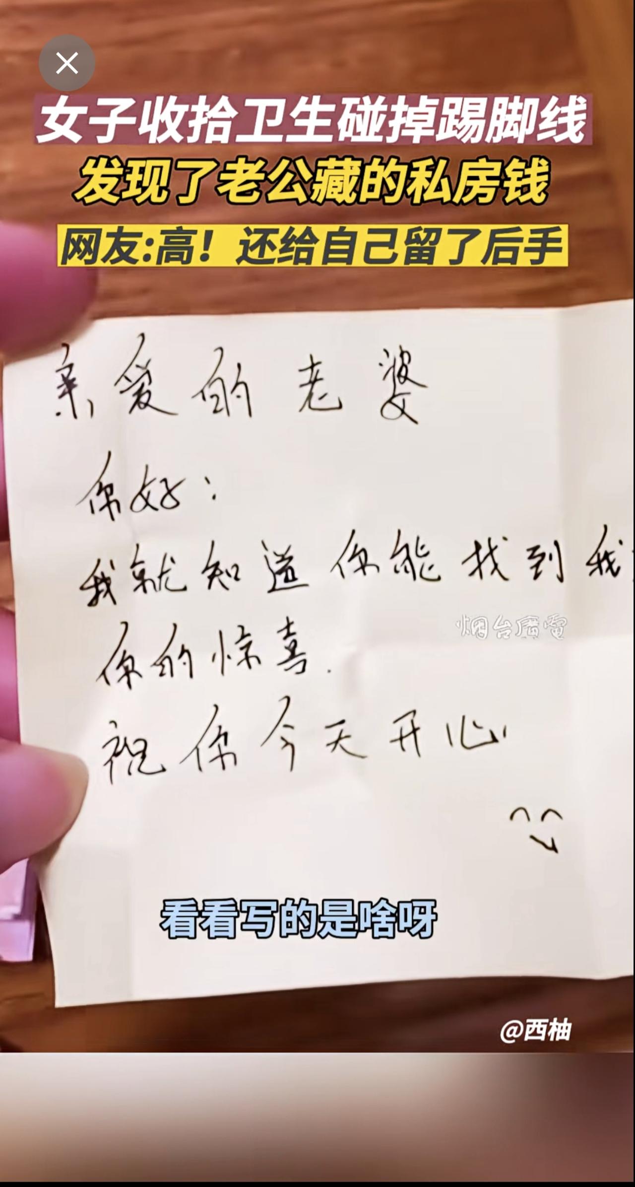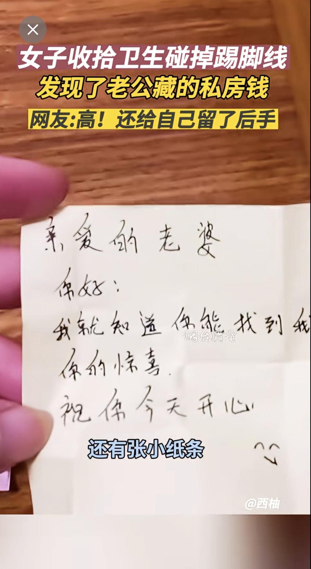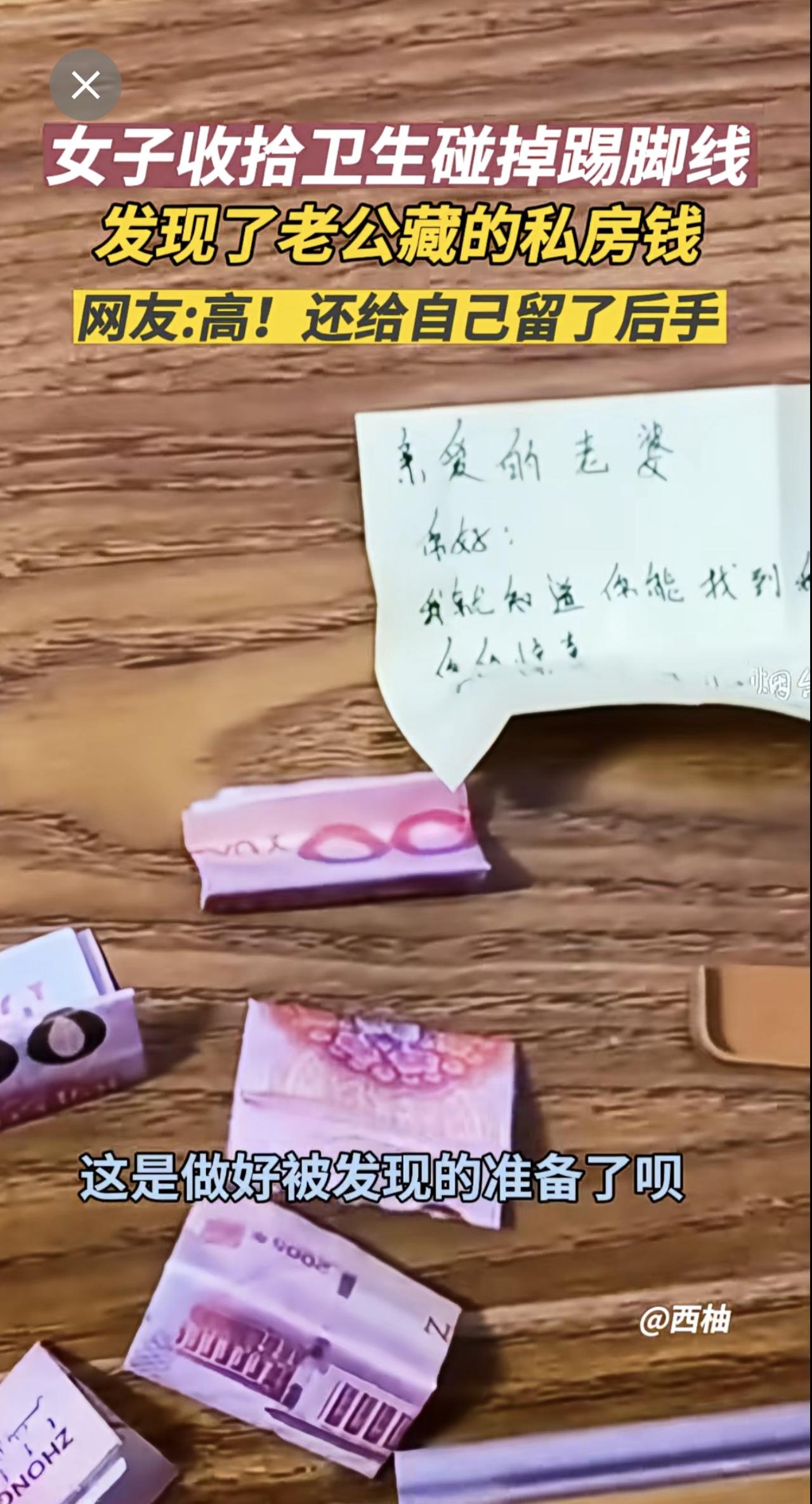 男子私房钱藏踢脚线被发现,还有张“保命纸条”