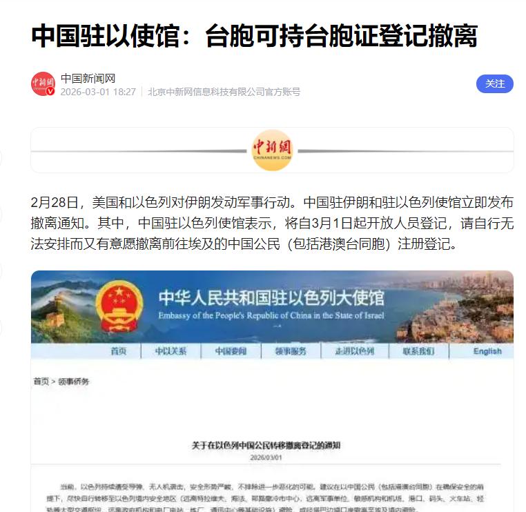 此次中东撤侨,中国要求台湾同胞出示台胞证才能协助撤离,岛内部分人表示不满,但他们忽略了最核心的逻辑:领事保护的前提是国籍身份。 大家记住一个最基本的事:不管哪个国家,驻外使馆的撤侨、保护本国公民,都只给自家人提供,这不是大陆定的规矩,是全世界都认的理,国际上也都这么做,没有例外。 简单说,只有你是这个国家的人,这个国家才会管你、保护你,这是最基本的前提,没什么好争辩的。 咱们国家有明确规定,领事保护只针对中国公民,驻外使馆的首要任务,就是保护中国公民的安全和权益。 这次撤侨,大使馆就是要把所有在当地的中国人都安全接回家,这里面肯定包括台湾同胞,因为台湾同胞本来就是中国人,这是板上钉钉的事,全世界都认可,没什么可抬杠的。 既然只保护中国公民,那肯定得确认你是不是中国人啊。咱们大陆人出门办事、坐飞机,都要拿身份证,身份证就是证明咱们是中国人的证件。 台湾同胞在台湾生活,没有大陆的身份证,所以大陆专门给台湾同胞发了台胞证,就是方便他们证明自己的中国公民身份。 台胞证不是什么特殊证件,也不是用来限制台湾同胞的,它和咱们的身份证一样,都是证明中国人身份的有效证件。 这次撤侨要台胞证,说白了就是确认一下身份,看看你是不是中国人、是不是我们要保护的同胞,这就是个最基本的流程,一点都不苛刻,根本谈不上刁难。 岛内那些不满的人,就是故意装糊涂:你想让中国大使馆救你、保护你,首先得承认自己是中国人,能证明自己是中国人啊。 不承认自己是中国人,还想享受中国的保护、用中国的撤侨资源,这在国际上都说不通,一点道理都没有。 这次撤侨,中国驻以色列使馆早就发了通知,明确说持台胞证的台湾同胞,和持中国护照的同胞待遇一样,都能登记撤离。 据台方自己统计,中东有三千多台湾同胞受战火影响,大陆的通知就是为了保护他们。反观台湾当局,除了嘴上安慰,根本没能力撤侨,连实际办法都拿不出来。 说到底,要台胞证不是刁难,是确认身份,是保护同胞。不认自己的国家,还想享受国家的保护,天下没有这样的道理。 台湾同胞本来就是中国人,危难时刻,大陆永远是最坚实的后盾,这一点,从来都没有变过。