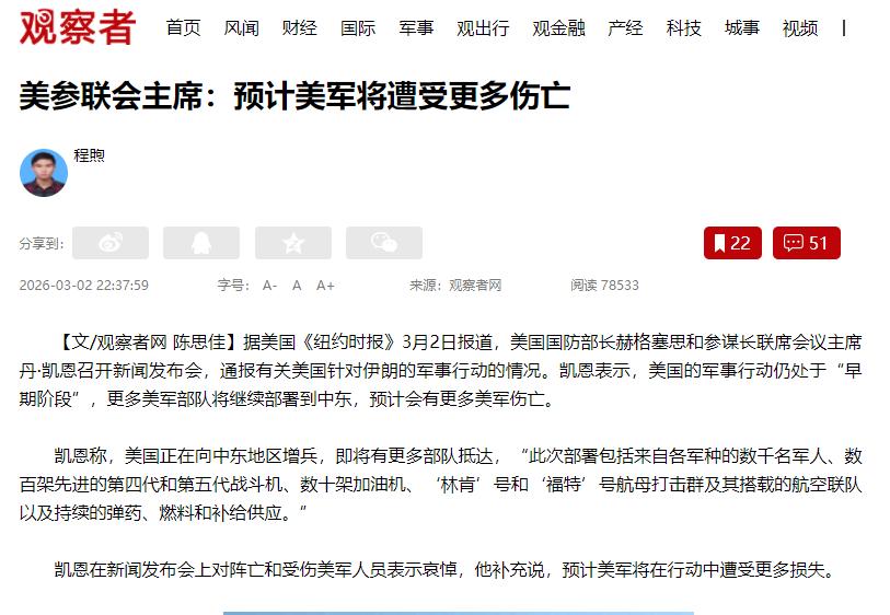 《纽约时报》3月2日有个重磅报道,美军官员自己透露,跟伊朗开仗才两天,美方就死了不少人、伤了不少人,这事儿直接说明,伊朗早就做好了打硬仗的准备,特朗普政府之前压根没料到伊朗这么能打。 美方一开始说,开战两天,有6名美军在科威特被伊朗的自杀式无人机打死,18人受了重伤;伊朗说的伤亡人数更多,说两天内打伤亡了650名美军,不过现在还没法确定谁的说法更准。 但不管人数多少,有一点是肯定的:才打两天,美军就有不少人伤亡,而且是一点预警都没有。 有知道内情的人说,伊朗的无人机精准打到了美军临时作战的地方,当时连防空警报都没响,士兵连躲起来的时间都没有,被炸的房子着了火,墙都炸掉了,营救了好长时间。 这绝对不是碰巧,能打得这么准、这么突然,肯定是提前准备了很久,绝不是临时抱佛脚。 有人可能会问,伊朗一直被美国制裁,怎么会这么能打?其实伊朗早就开始准备打仗了,只是特朗普政府没当回事。 早在2025年1月,伊朗就搞了一场大规模的陆海空军演,持续了两个月,所有精锐部队都参加了,还测试了新武器,当时就说要应对美国和以色列的威胁,可特朗普政府觉得,伊朗就是装装样子,没放在心上。 除了军演,伊朗的武器也准备得很足。这次打仗,伊朗用得最多的不是导弹,而是无人机,而且数量特别多。 开战两天,伊朗往周边美军基地发射的无人机,比导弹还多,光往阿联酋就射了500多架,科威特快300架。 这种无人机不贵,一架才5万美元左右,伊朗能大量生产,而且能低空飞,美军的防空系统根本探测不到,还能飞1000公里,精准打目标。 再看特朗普政府,之前对伊朗的判断错得离谱。特朗普3月3日还公开说,伊朗的军事能力几乎被摧毁了,导弹也快用完了,接下来还会被打得更惨。 可事实是,美军才打两天就伤亡惨重,伊朗的无人机、导弹还在接着打,特朗普的话直接被现实打脸了。 特朗普为啥会看错?说白了就是太傲慢,看不起伊朗。他觉得伊朗被制裁得经济不好,又没什么外部支持,国内还有过抗议,只要美军一动手,就能快速打垮伊朗。 他还以为伊朗会害怕、会屈服,没想到伊朗直接硬刚,这时候美国想收手都不行,只能硬着头皮打,可他压根没料到,伊朗早就准备好了。 其实不是伊朗比美国强,是伊朗找对了打法,还做足了准备。伊朗知道自己常规军事力量不如美国,就不跟美国正面硬刚,用便宜的无人机、导弹打美军基地,还在地下建了隧道存武器,美军根本毁不掉。 总结下来就是,美军打两天就伤亡惨重,不是偶然,是必然。伊朗早就做好了打仗的准备,特朗普政府太自大、低估了伊朗,才造成这样的结果。 这也提醒我们,不管是国家还是个人,做事都要做好准备,不能盲目自大,不然迟早要栽跟头。