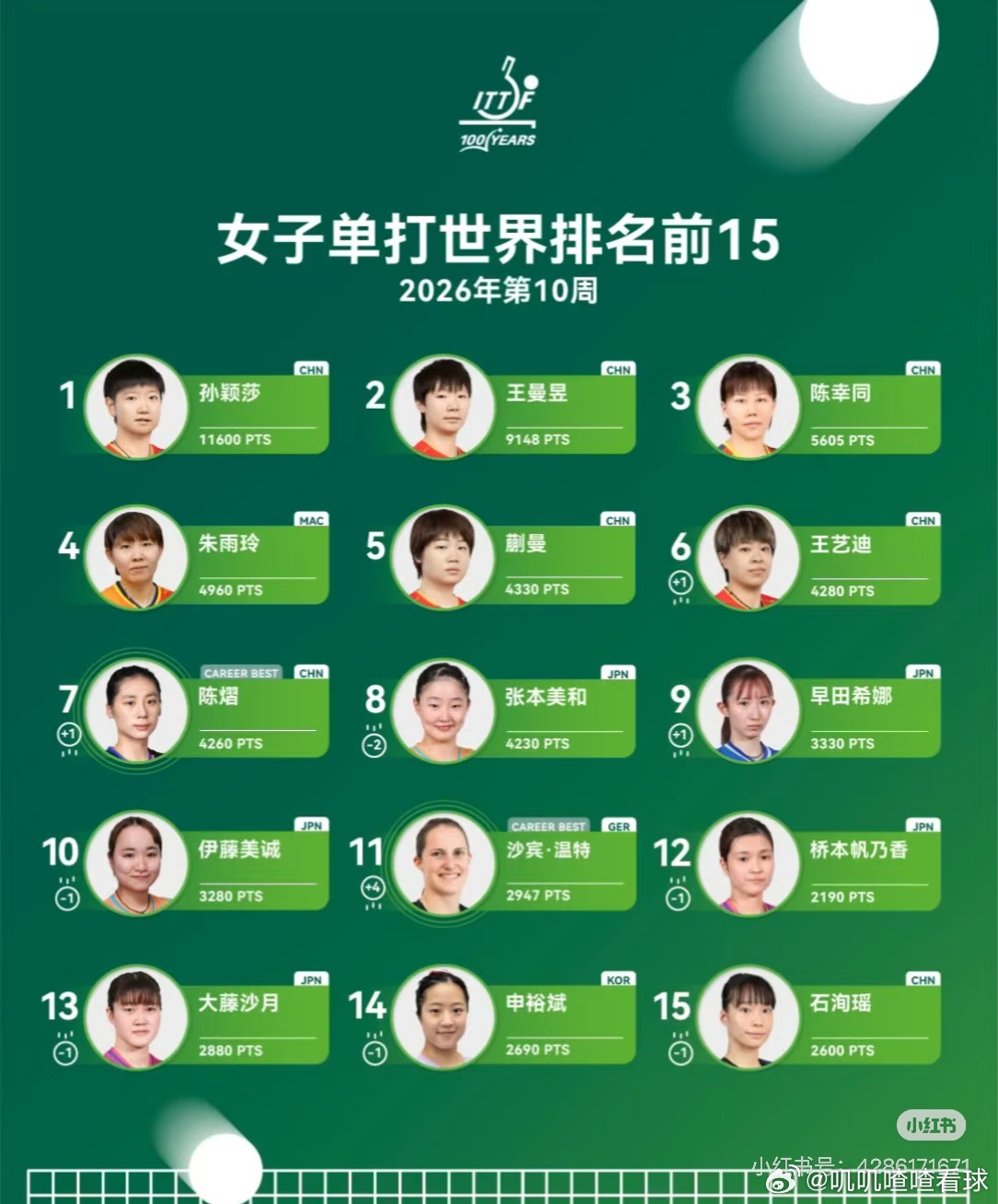WTT新加坡大满贯2026女单四强陈熠排名上1个名次位列第7,刷新个人职业生涯排名新高;四强沙宾·温特排名上4个名次位列第11,刷新个人职业生涯排名新高;八强王艺迪排名上升1个名次位列第6;八强早田希娜排名上升1个名次位列第9;三十二强韩莹排名上升2个名次位列第20;三十二强付玉排名上升9个名次位列第47。其他中国队球员,石洵瑶排名第15,何卓佳排名第37,覃予萱排名第38。