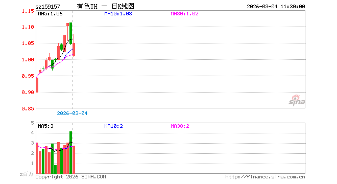 3月4日,截止午间收盘,有色金属ETF天弘(159157)涨0.38%,报1.050元,成交额2.89亿元。有色金属ETF天弘(159157)重仓股方面,洛阳钼业截止午盘跌2.26%,北方稀土涨0.58%,中国铝业涨3.44%,兴业银锡跌5.18%,云铝股份涨6.53%,铜陵有色跌1.03%,江西铜业跌1.34%,厦门钨业涨2.61%,中金黄金跌4.60%,西部矿业跌1.93%。
