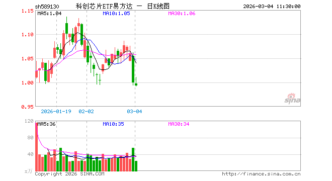 科创芯片ETF易方达(589130)业绩比较基准为上证科创板芯片指数收益率,管理人为易方达基金管理有限公司,基金经理为李栩,成立(2025-12-29)以来回报为-0.41%,近一个月回报为-5.24%。