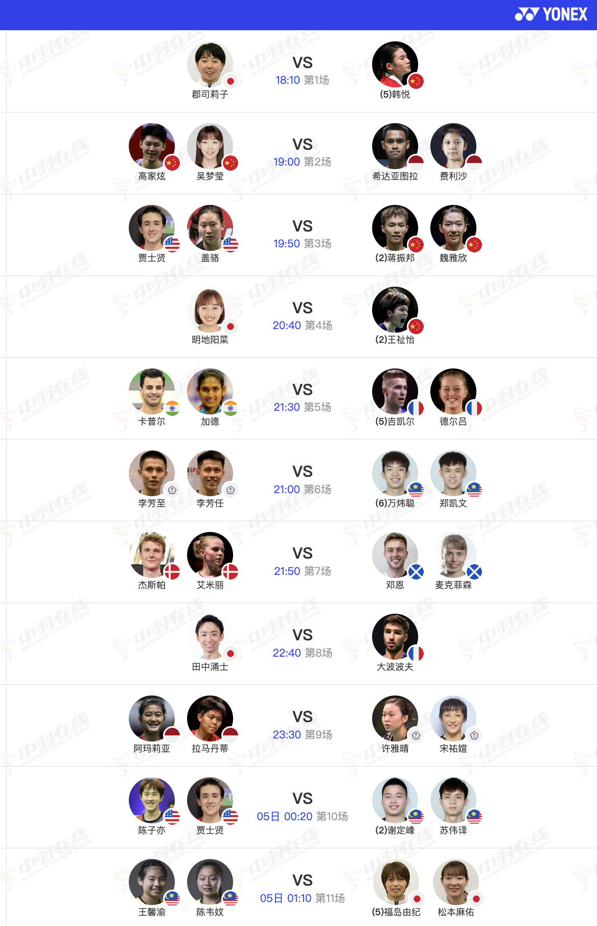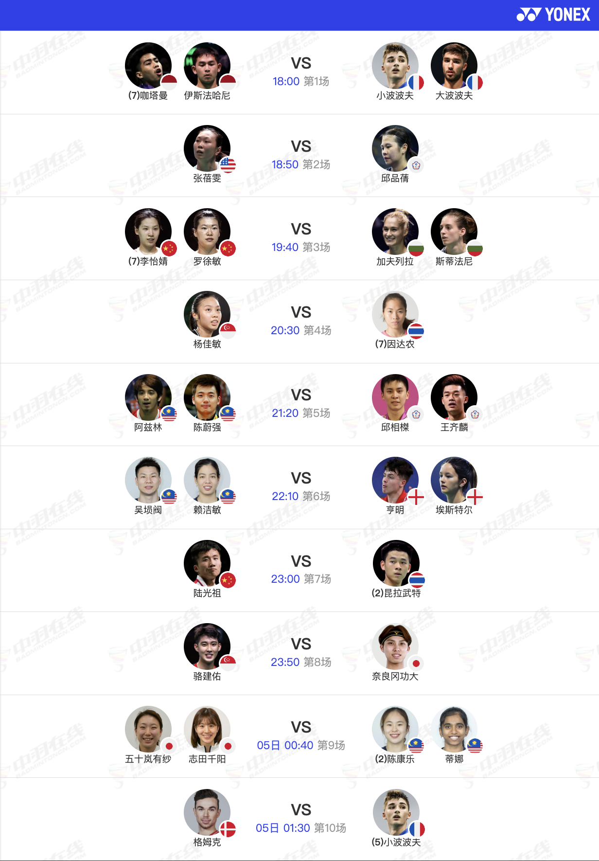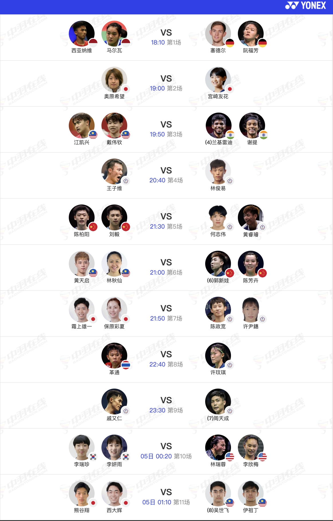2026全英羽毛球公开赛 3月4日首轮第二日赛程,晚上18点开赛:
