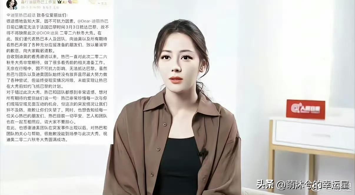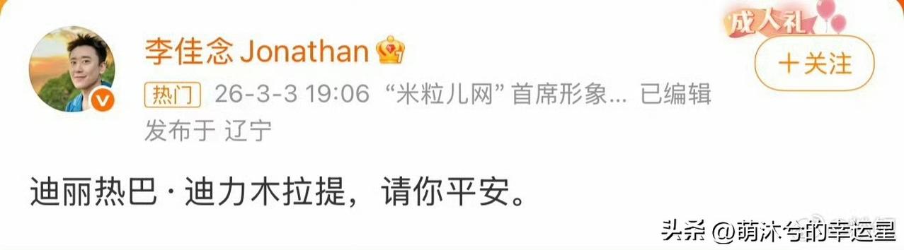 李佳念 迪丽热巴请你平安 李佳念的发文,让不少人又开始担心起了迪丽热巴,目前迪丽热巴本人并没有报平安。 热巴已经在迪拜被困了四天,而她团队已经直飞到了巴黎,真的太过荒谬,真正参加大秀的艺人,独自转机,其他团队辅助人员反而都是直飞到巴黎。热巴现在已经不是能不能参加大秀的问题,是怎么回国的问题。 迪丽热巴前四年去巴黎都是直飞,唯独这一次是中转,而且已经在大使馆提前发出警告后,竟然依然安排中东转机,直飞不买偏转机,出事没预案,安全意识约等于零。热巴平安就好,但真的快点解约吧,别再耽误事业了,心疼热巴自己扛所有,赶紧开启事业新阶段! 李佳念 迪丽热巴请你平安