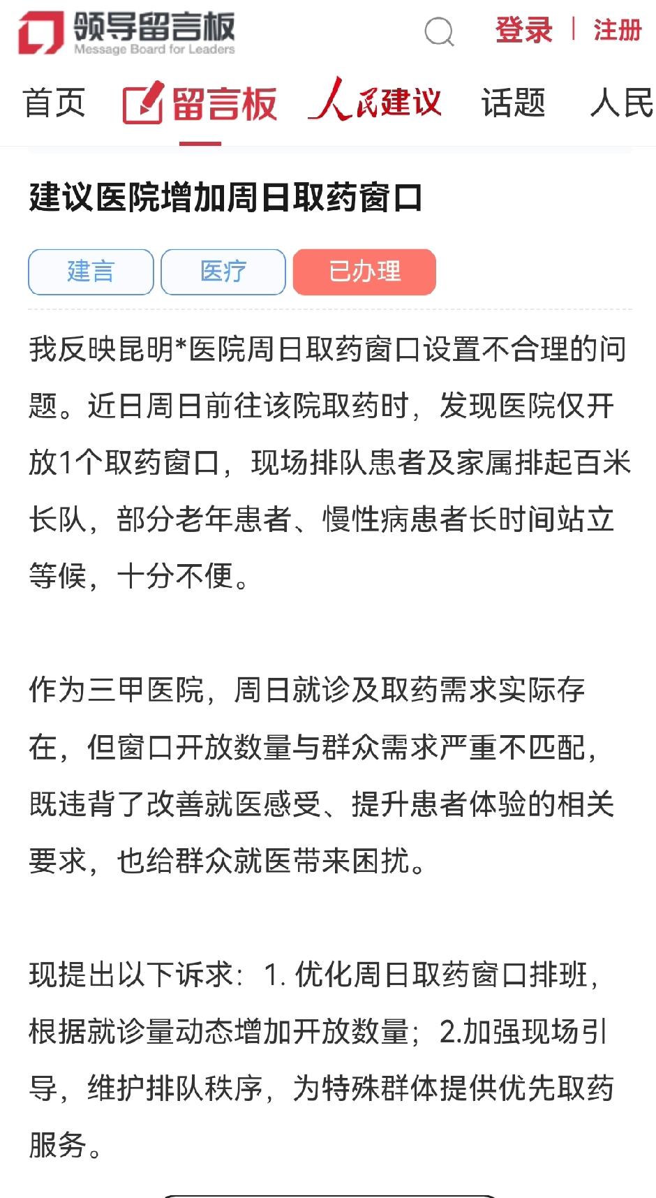 昆明网民向云南省省长建言昆明某医院增加周日取药窗口方便患者取药! 近日昆明网民通过领导留言板给云南省长留言: ✍📩建议医院增加周日取药窗口 我反映昆明*医院周日取药窗口设置不合理的问题。近日周日前往该院取药时,发现医院仅开放1个取药窗口,现场排队患者及家属排起百米长队,部分老年患者、慢性病患者长时间站立等候,十分不便。 🏥作为三甲医院,周日就诊及取药需求实际存在,但窗口开放数量与群众需求严重不匹配,既违背了改善就医感受、提升患者体验的相关要求,也给群众就医带来困扰。 现提出以下诉求:1. 优化周日取药窗口排班,根据就诊量动态增加开放数量;2.加强现场引导,维护排队秩序,为特殊群体提供优先取药服务。 希望相关部门督促医院整改,切实解决群众取药排队难问题,提升就医获得感。感谢领导关注! 2026-02-15 19:00 📢📩云南省卫生健康委员会官方回复 网民同志: 云南省卫生健康委员会高度重视患者反映问题,经昆医***院排查,排队现象主要源于周日药师排班人数不足,人力配置无法满足当日取药服务需求。 💊💊💊针对上述问题,医院制定针对性整改措施,切实保障患者取药便捷性。自2026年2月1日起,门诊西药房周日新增1个发药窗口,通过优化窗口配置缓解排队压力。 后续,将持续监测周末药房发药流量及就诊量变化,建立动态调整机制,根据实际就诊需求灵活增加窗口开放数量,不断优化服务流程,提升取药服务效率,切实改善患者就医体验。 医院 取药