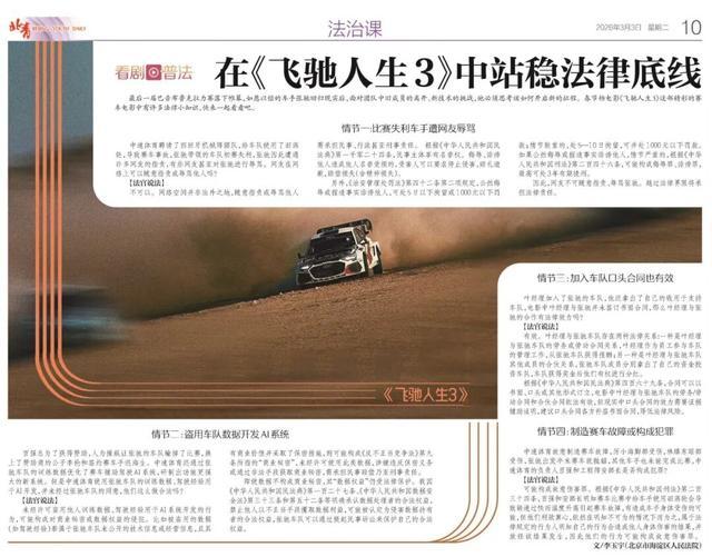 最后一届巴音布鲁克拉力赛落下帷幕,如愿以偿的车手张驰回归现实后,面对团队中旧成员的离开、新技术的挑战,他必须思考该如何开启新的征程。春节档电影《飞驰人生3》这部精彩的赛车电影中有许多法律小知识,快来一起看看吧。