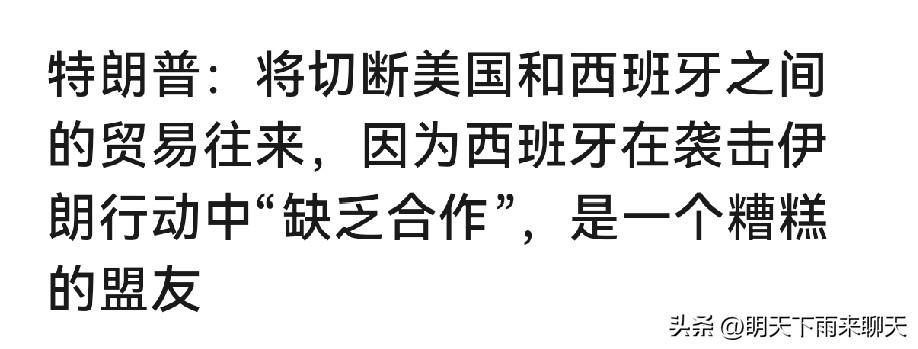 特朗普这是又发威了? 这又是逼其他国家站队,也不想想你这次都干了些啥事,谁敢盲从?这不助纣为虐吗?虽然说许多国家迫于压力,不敢谴责,但心里明镜似的,你丫就是在乱搞。 西班牙这次是当了回出气筒,不允许老美使用军事基地的国家又不止西班牙一家,咋只找西班牙麻烦呢? 老特这是杀鸡儆猴吧,西班牙这个刺头在军费问题上就不合群,这次就狠狠拿捏它一下,顺便看看还有没有国家敢说不,顺我者昌,逆我者亡。
