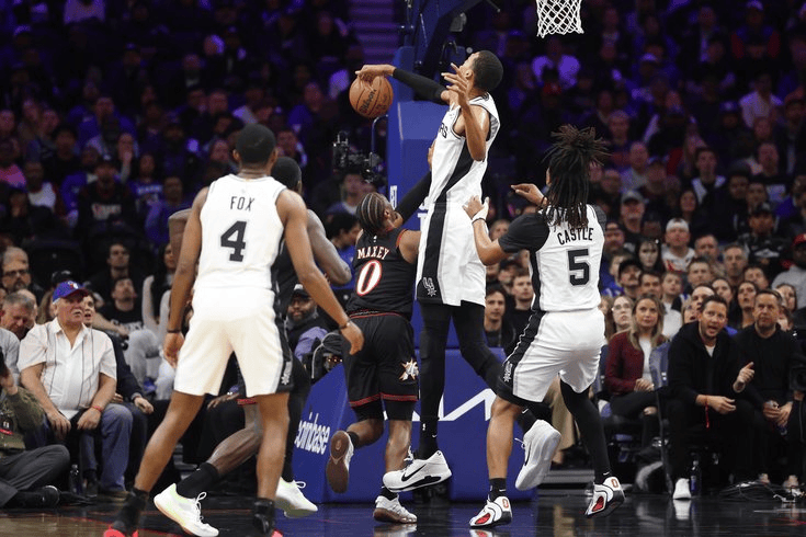 马刺球员文班亚马全场仅出手5次,5投3中、三分1中1得到10分8篮板4助攻3抢断6盖帽。