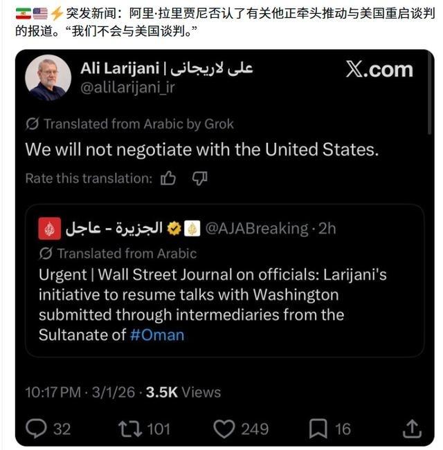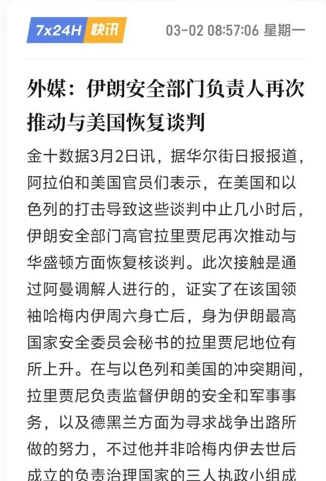 果不其然吧,说伊朗拉里贾尼和它在接触想谈判,特朗普故意释放的烟雾弹。 特朗普那边刚放风,说伊朗新领导层主动找上门想谈了,他还点头同意接触。结果伊朗那边立马跳出来否认,拉里贾尼直接在社交平台上怼回去,说根本没这回事儿。特朗普这招一看就是老套路,先造势说对方服软,好让自家看起来占上风,顺便压压油价,别让通胀再炸锅。毕竟美联储已经停降息好几个月了,他还指望继续宽松呢。现在战火烧得这么猛,谁先眨眼谁就输面子,可伊朗那边摆明不吃这套。 2026年2月28日,美以联手空袭,代号“史诗狂怒”,精准打掉德黑兰关键建筑,哈梅内伊当场丧生。伊朗马上启动“真实承诺-4”,向美军在中东基地和以色列发射数百枚导弹无人机。巴林第五舰队总部、卡塔尔乌代德基地、科威特阿里夫詹基地、以色列本土多处目标中招。伊朗报告说行动覆盖约旦沙特境内美军设施,美方承认士兵伤亡和设施损毁。 特朗普3月1日接受采访,放话说伊朗新领导想对话,他同意了。媒体跟进报道,通过阿曼渠道拉里贾尼探询重启核谈可能。这明显是特朗普想制造伊朗内部分裂假象,动摇抵抗意志,顺便稳住油价对美国经济冲击。伊朗通胀本来就高,油价再飙对特朗普不利,他急需美联储降息空间。可3月2日拉里贾尼直接发文否认,强调伊朗不会跟美国谈,指责特朗普政策把中东搞乱,现在担心美军损失继续扩大。他重申伊朗只自卫,没侵略意图。反击还在继续,美军基地和以色列目标接连挨打,战况超美方预期。 冲突第三四天,伊朗多轮导弹覆盖更多区域。特朗普公开说行动可能拖四周,不排除地面部队,但同时留对话口子。拉里贾尼继续主导安全响应,在声明里坚持抵抗到底,拒绝任何让步。美以打击毁掉部分指挥链和设施,可伊朗组织能力还在,导弹发射没停。拉里贾尼作为临时领导委员会外实际军事协调者,主持会议审阅报告调整部署。目前没迹象他会软化,局势高强度对抗拉锯中。