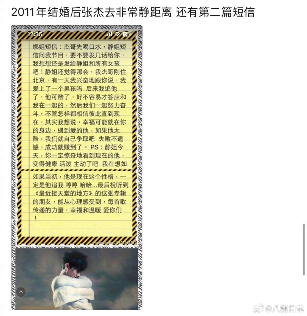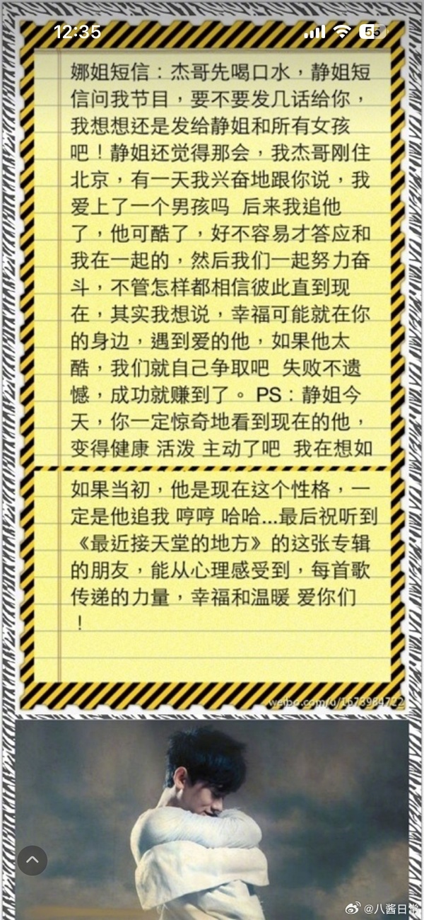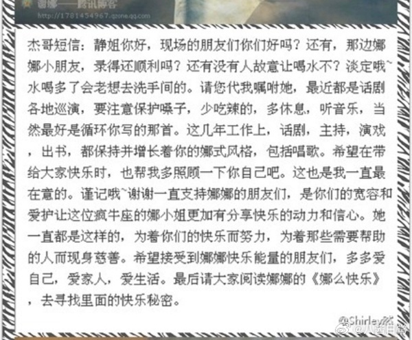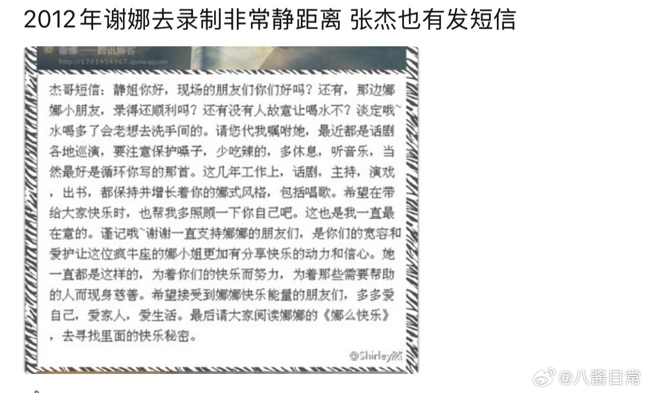 2007年1月谢娜发给好友李静的一条短信截图,谢娜说她好喜欢张杰。2011年结婚后张杰、谢娜分别去李静的节目《非常静距离》俩人都为对方发了短信