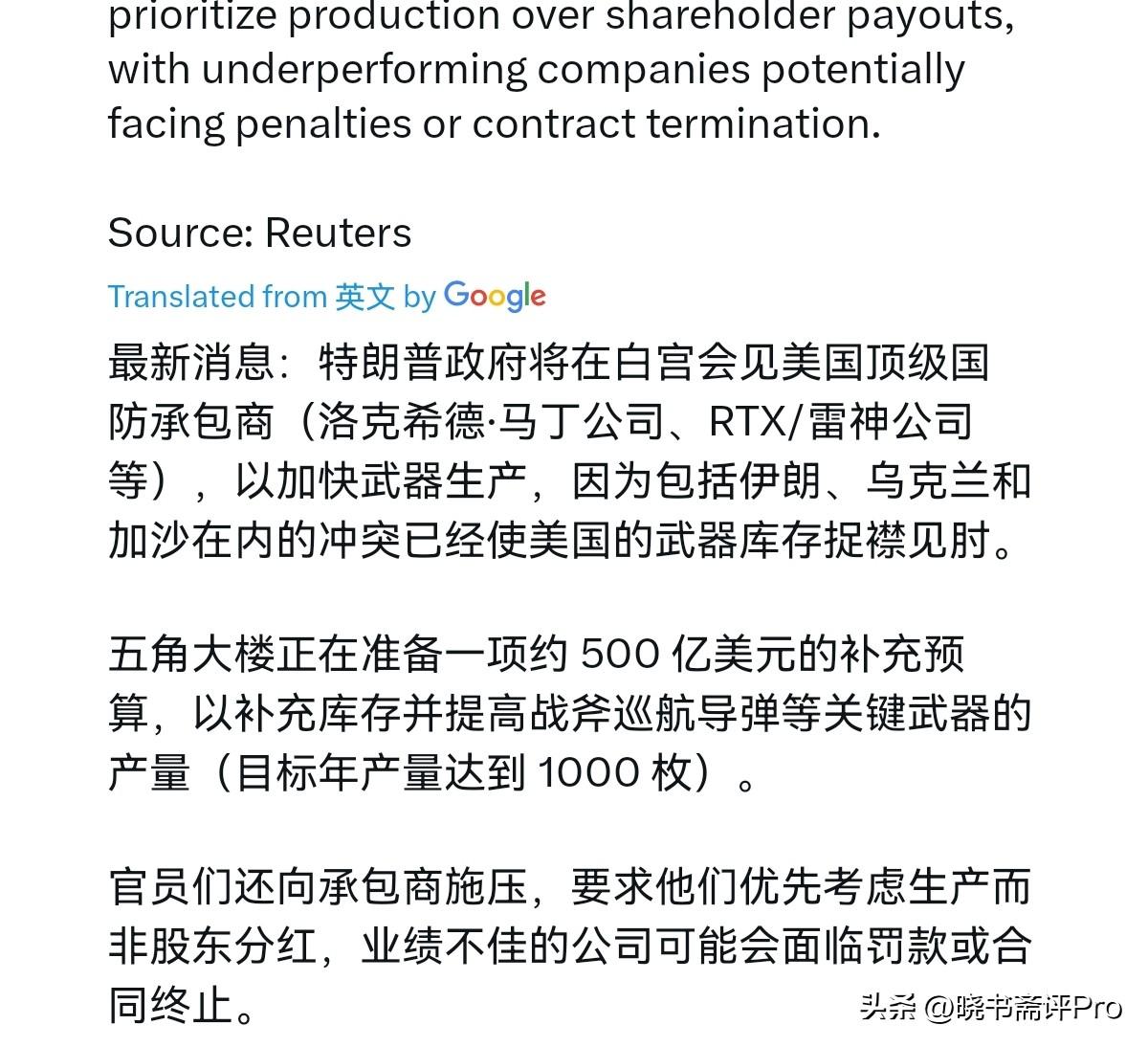 急了,急了!美国政府下死命令,要求美国军工企业连轴转,加班加点生产导弹!3月4日,根据外媒报道,外媒称,特朗普政府将会见美国顶级国防承包商。包括洛克希德·马丁公司、雷神公司等。白宫的一位发言人表示,他希望加快武器生产,因为美国的武器库存因伊朗、乌克兰和加沙等冲突而紧张。 与此同时,五角大楼正在准备一项约500亿美元的补充预算,以补充库存,并增加战斧巡航导弹等关键武器的产量。官员们还向承包商施压称,美国政府要求其优先考虑生产,而不是只考虑股票回报,而表现不佳的公司可能面临罚款或合同终止。很显然,对美国的军工巨头,美国政府给钱,给压力,这充分说明特朗普政府急了。 此前,特朗普还声称,我们的武器库存从未像现在这样充足、性能优良。我们拥有前所未有数量的中高端弹药——几乎无限。但是,事实证明,实际情况根本不是那么回事。美国政府现在的意思很清楚,军工企业从现在开始,必须加足马力,全力保障武器供应,这是下了死命令。 事实证明,伊朗是块难啃的硬骨口,美国对于打击伊朗完全准备不足,低估了打伊朗的难度。如果美国政府知道局面是这么个情况,恐怕美国根本不会贸然实施打击。但是,开弓没有回头箭。尽管美国自己宣布实施了一系列有效的打击,但是看起来美国让伊朗屈服的目标还远未实现。美国现在最揪心的恐怕是,这一场冲突会不会制造美国新的债务窟窿。