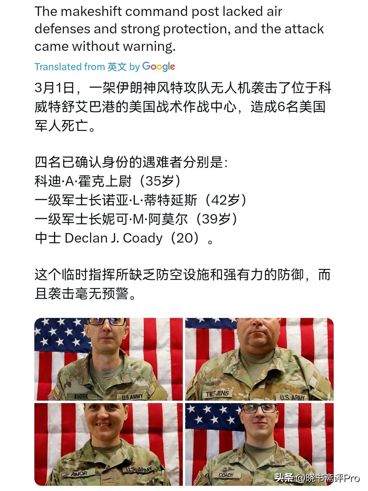 6名美国军人死亡!外国博主评论很扎心:中国阅兵亮出成体系、全手段、专门打“低慢小”的反无人机系统,为什么美军在中东却连最基础的末端防护都没配齐,被如此慢无人机直接炸穿!3月4日,外媒报道称,3月1日,一架伊朗无人机袭击了位于科威特舒伊巴港的美国战术作战中心,造成6名美国军人死亡。已确定的四名受害者是: 科迪··霍克上尉(35岁) 上士诺亚·蒂金斯(42岁) 一等士官妮可·m·阿莫(39岁) 德克兰·j·科迪中士(20岁)。 美国方面坦言,临时指挥所缺乏防空和强大的保护,袭击毫无预警。说实话,伊朗的无人机最快速度不到200千米/时,又是低空飞行,按道理说,美国要进行拦截难度并不大。结果呢?结果是,美国方面竟然声称袭击毫无预警,以美国的信息情报能力,这简直是胡扯。 恐怕根本的原因是,面对伊朗的无人机群,美国的防空系统要么是不堪重负,要么是没料到这有人敢打美国的军事基地,以至于临时指挥所被击穿。有外国博主以非常流口水的方式表示,要是美国部署中国9.3阅兵亮出来的微波反无人机系统,或者激光反无人机系统,伊朗的无人机根本不是问题。很显然,这样的伤亡,是美国防空系统形同虚设的鲜明例证。