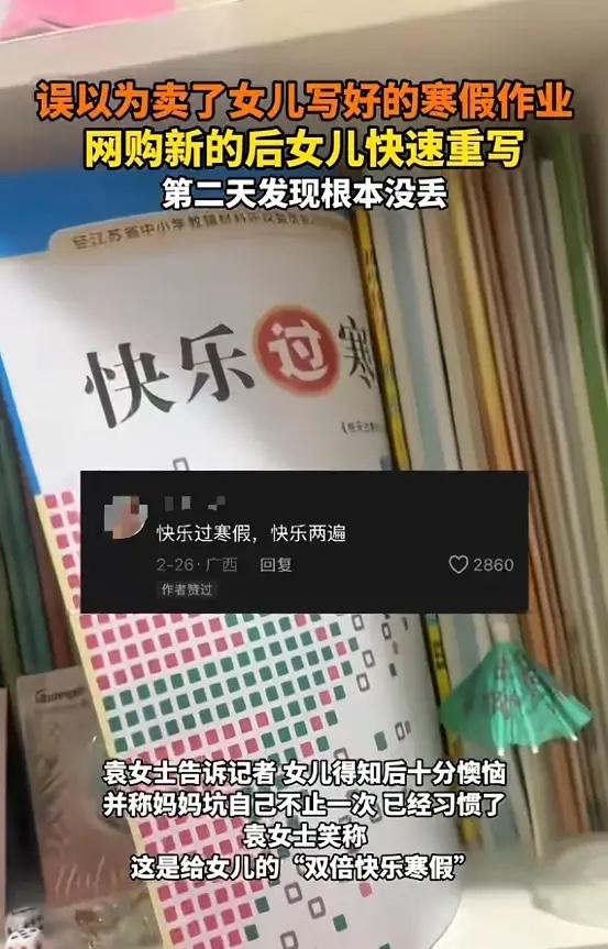 “笑不活了!”近日,江苏泰州,一女子以为自己将女儿写好的寒假作业卖掉,便买了一本新的,女儿快速写完新作业后,女子才发现作业根本没丢!这让女儿十分懊恼,表示女子坑自己不止这一次,现在已经习惯了!网友:真的亏大了! 这事儿发生在2026年2月底,寒假快结束的时候。泰州的袁女士在家收拾废品,准备卖掉。她记得女儿说过作业写完了,就顺手把桌上几本旧练习册一起打包,卖给了收废品的大爷。卖完心里还挺美,觉得家里整洁了。 晚上女儿回家,找作业本。袁女士一拍脑袋:“坏了,好像让我当废纸卖了!”女儿一听,小脸都垮了。辛辛苦苦写了一个寒假的成果,说没就没了?马上就要开学,这可咋办? 袁女士也急,赶紧上网搜。还真有卖同款寒假作业的,她二话不说下单买了一本新的。快递给力,当天晚上就送到了。女儿看着崭新的作业本,欲哭无泪。能怎么办?硬着头皮重写呗。 那一晚上,小姑娘房间的灯亮到很晚。她咬着笔头,凭着记忆,把那些做过的题、写过的作文,又赶工一样重新抄了一遍。手都写酸了,心里憋着一股气。妈妈在旁边陪着,又是递牛奶又是削水果,满脸愧疚。 好不容易熬到凌晨,总算把新作业本填满了。女儿累得倒头就睡。第二天早上,袁女士想着把书架整理一下。这一整理,出大事了。那本“被卖掉”的旧作业本,好端端地立在书架最里面。 袁女士拿着两本一模一样的作业本,一本崭新字迹未干,一本旧旧的字迹工整,整个人都懵了。她叫醒女儿,把两本作业都摆在她面前。女儿揉着眼睛坐起来,愣了几秒钟,然后“哇”一声,不是哭,是那种又好气又好笑的哀嚎。 “妈!你怎么又这样!”女儿控诉。原来,这已经不是第一次了。上次袁女士大扫除,差点把她珍藏的漫画书当废品扔掉。用女儿的话说:“我妈坑我,都坑出经验了。” 袁女士把这段经历拍成视频发上网,本意是自嘲一下。没想到,一下子戳中了好多家长的共鸣。评论区里热闹极了。有网友心疼小姑娘:“孩子实惨,寒假体验卡续费一次。”也有网友调侃袁女士:“这是给孩子的‘双倍快乐寒假’,一份耕耘,两份收获(作业)。” 更多家长在下面分享自己的“坑娃”事迹。有的把孩子的准考证当废纸扔了,临考前全家翻垃圾桶;有的洗衣服时没掏口袋,把孩子好不容易攒的零花钱洗成了一团纸浆。大家发现,这种让人哭笑不得的“乌龙”,在很多家庭都上演过。 笑过之后,其实挺值得琢磨。为什么家长总会犯这种迷糊?很多时候不是不上心,恰恰是太“上心”了。脑子里装着工作、家务、孩子的吃喝拉撒、老人的身体,像个高速旋转的陀螺。收拾东西时想着赶紧弄完,眼睛看到了,手也动了,但脑子可能还在想别的事。一不留神,就把重要的东西归到了“不重要”的那一堆。 好在袁女士一家把这事当成了段子。妈妈敢于自嘲,女儿也能用“习惯”来化解尴尬。这种轻松的相处方式,反而让一次失误变成了家庭的共同记忆。在忙碌的生活里,或许可以稍微慢一点,多问孩子一句:“这个你还要吗?”也提醒孩子,重要的东西,记得放在妈妈“绝对不会扔”的地方。 生活就是由这些小小的意外和误会组成的。处理好了,是笑料;处理不好,可能就是心结。多一点沟通,少一点想当然,家的“糊涂账”就会少很多。 各位读者你们怎么看?欢迎在评论区讨论。