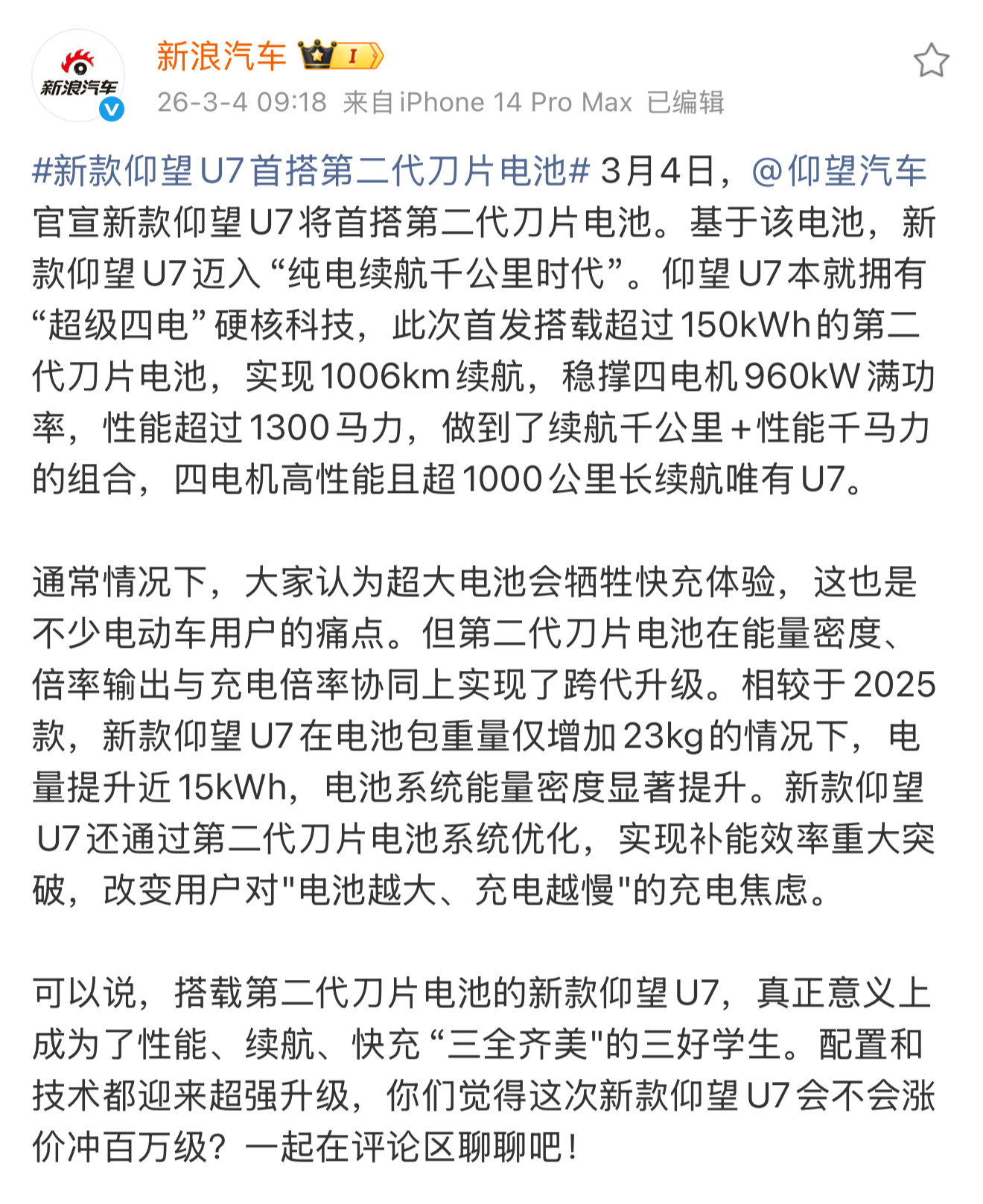 新款仰望U7首搭第二代刀片电池,纯电续航干到1006公里,这续航有点牛
