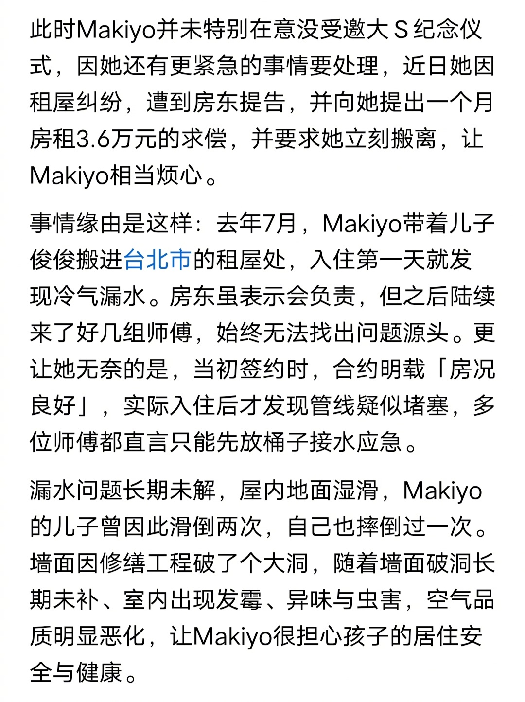Makiyo回应未出席大S雕像揭幕仪式台湾女明星这么惨吗?Makiyo租了一个破
