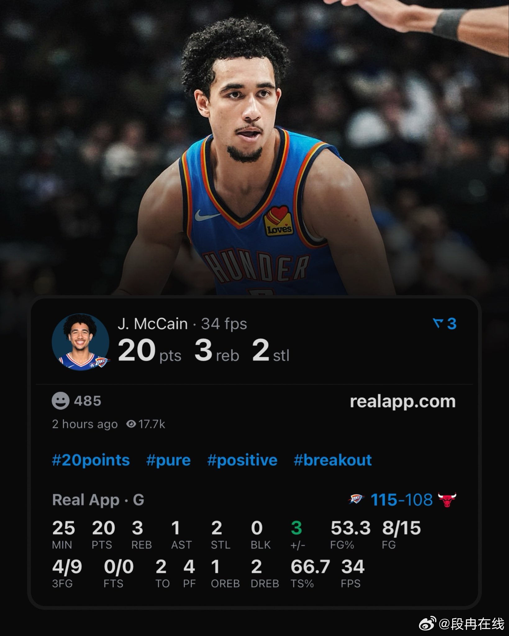 上赛季的麦凯恩,在上升期遭遇大伤赛季报销。而在休赛期76人又在选秀中选到了同样是后卫的埃奇库姆。埃奇库姆的到来,也大大压缩了麦凯恩的登场时间。交易截止日前,麦凯恩通过交易来到雷霆。谁曾想,也就是因为这笔交易,麦凯恩在雷霆一步步地兑现天赋,打出了自己的价值。本场面对公牛,麦凯恩轰下20分,可以说是成功站稳了雷霆第六人的位置。雷霆战胜公牛