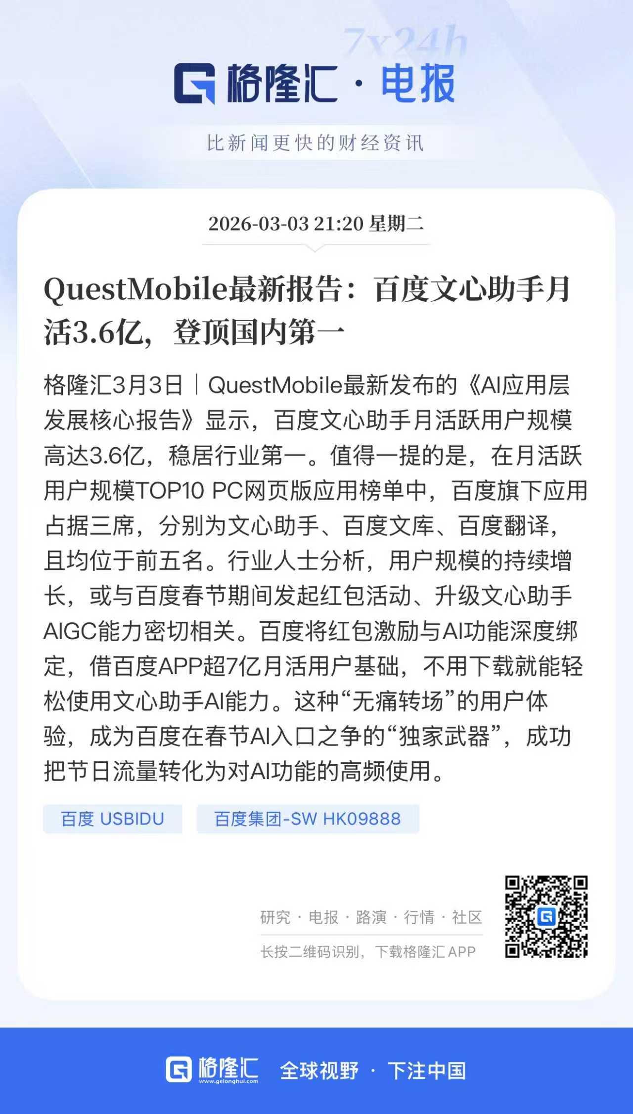 权威报告:3.6亿月活登顶,百度文心助手凭什么领先? 春节刚过,当大家还在回味红包抢了多少时,AI战场的一场“闪电战”已经悄悄分出了胜负。3月3日,QuestMobile的报告让不少人有些意外:百度文心助手月活跃用户规模直接冲到了3.6亿,稳稳坐在了行业第一的位置! 3.6亿,说实话,这个数字其实并不让人感到突兀,那这个数字是怎么在春节假期里冲上去的?很多人第一反应可能是:百度又撒钱了。没错,红包激励是标配,但今年百度的聪明之处,在于把红包和AI能力做了深度“捆绑”,打出了一套让对手难以复制的组合拳。 想象一下这个场景:你正闲着无聊刷着百度APP获取信息,突然发现有个入口,点进去不仅能领红包,还能直接跟一个“无所不知”的AI对话。它帮你写文案、总结热点、解答问题,甚至能生成图片。整个过程,你甚至不需要多走一步路去下载一个新应用。 这就是百度在这次春节战役中的“独家武器”——无痛转场。依托百度APP本身超过7亿的月活用户,文心助手不再是那个需要你费劲下载、注册才能使用的独立应用,而是变成了一个“伸手就能够到”的内置能力。用户从看新闻、搜信息,到使用AI,中间没有任何割裂感。这种体验,就像从客厅走到阳台一样自然。 正是这种设计,把春节汹涌的流量,高效地转化成了对AI功能的高频使用。用户奔着红包的“甜头”来,却在不知不觉中体验了AI的“甜头”,最终留了下来。百度没有强行教育用户“AI有多好”,而是让用户在玩红包、搜信息的过程中,自然而然地用上了AI。这或许才是文心助手能迅速触达3.6亿用户,并登顶国内第一的真正逻辑。 春节的流量盛宴已过,但百度这招“无痛转场”,无疑为行业提供了一个新思路:在AI时代,谁能用最轻、最快的方式,让用户“无感”地踏入AI世界,谁就能率先拿到通往未来的船票。