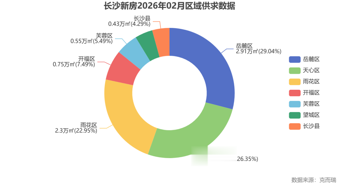 2026年2月,长沙楼市区域分化愈发明显。主城核心区(岳麓区、雨花区、天心区)成交占比突出,而外围区域成交不足7%。
