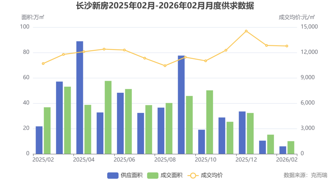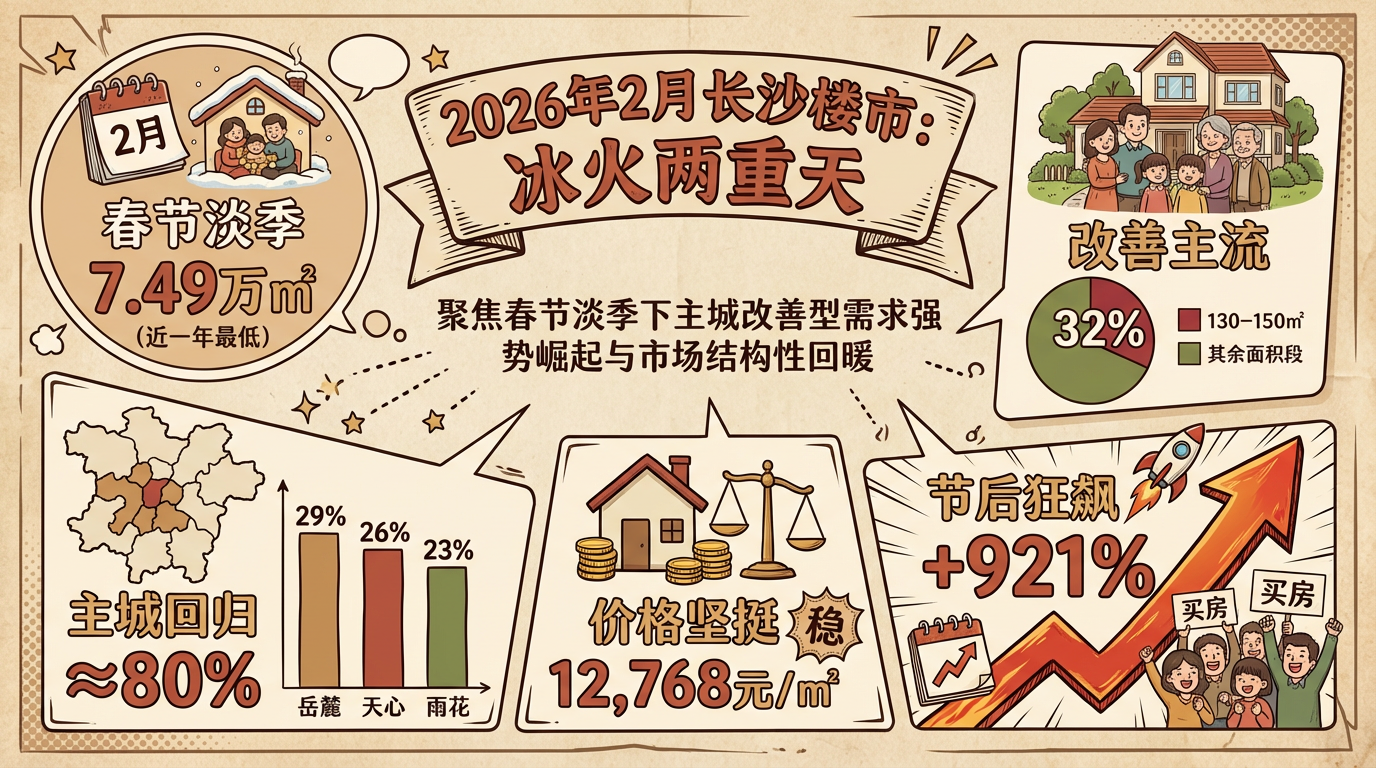2026年2月,长沙楼市交出了一份“理性而克制”的成绩单。受春节假期(2月17日至23日)影响,新房市场整体处于传统淡季,供应收缩、成交量低位运行。