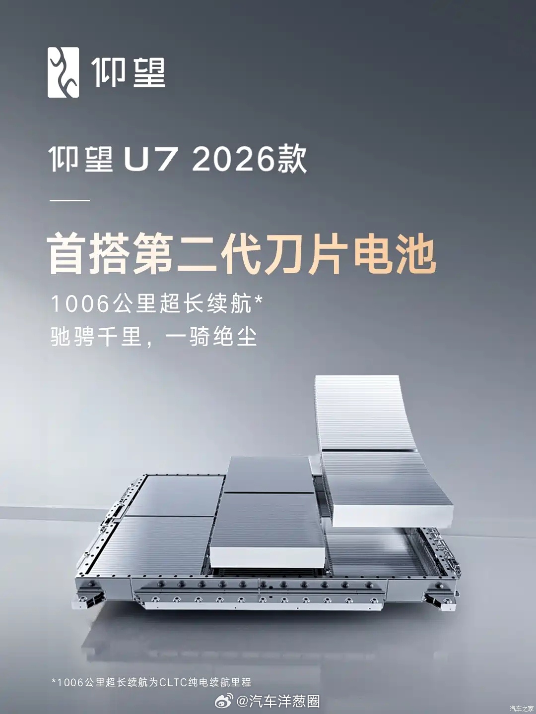 比亚迪第二代刀片电池将装备2026款仰望U7,续航里程达到1006公里。