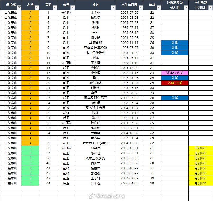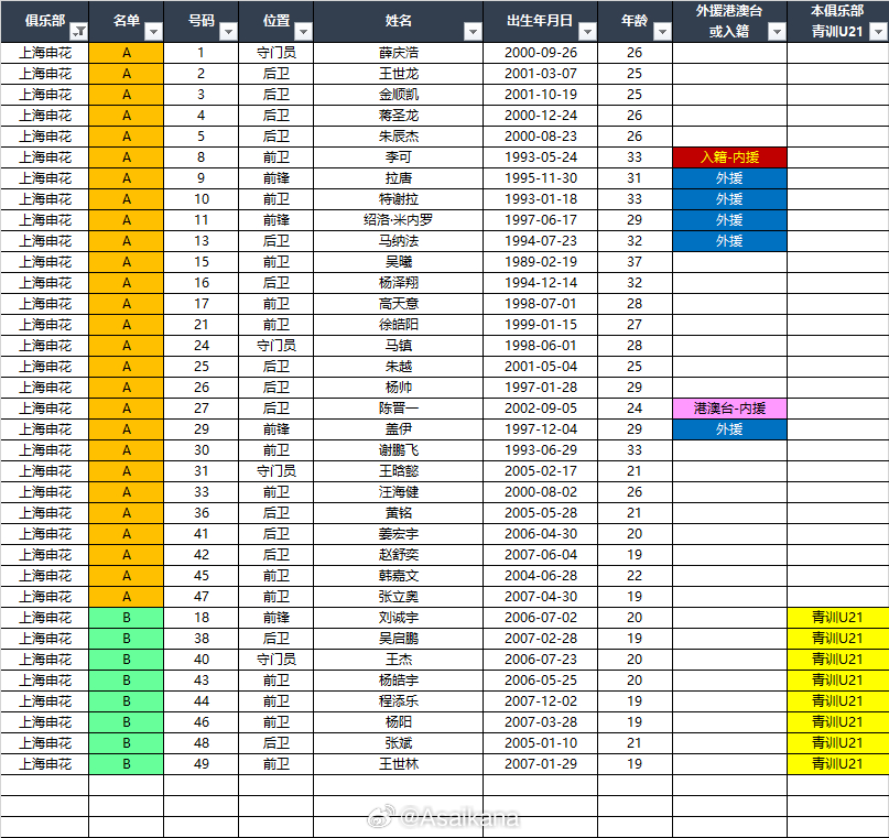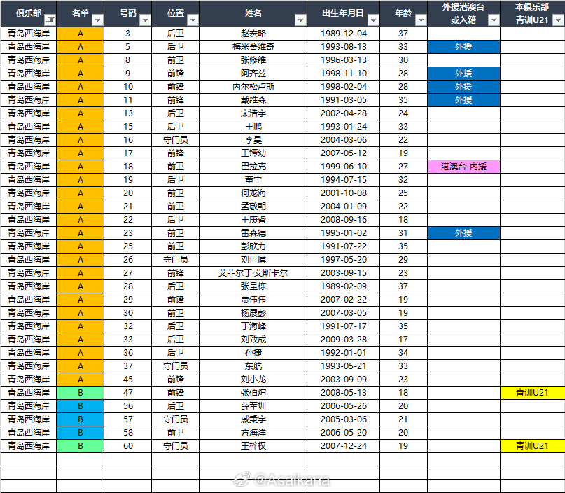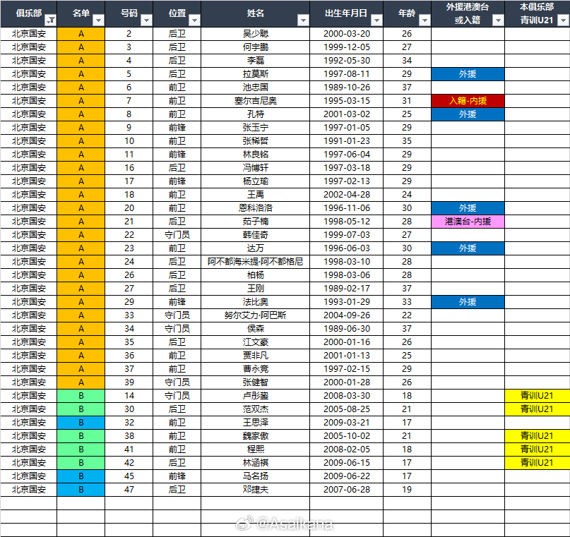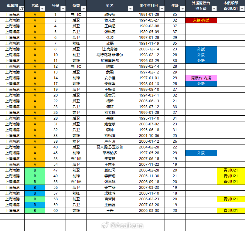 2026中超联赛各队报名名单(季前)*自整理,青训U21的标注不一定准确,仅供参考,请以官方发布为准EXCEL下载链接:网页链接 百度网盘提取码: CF26