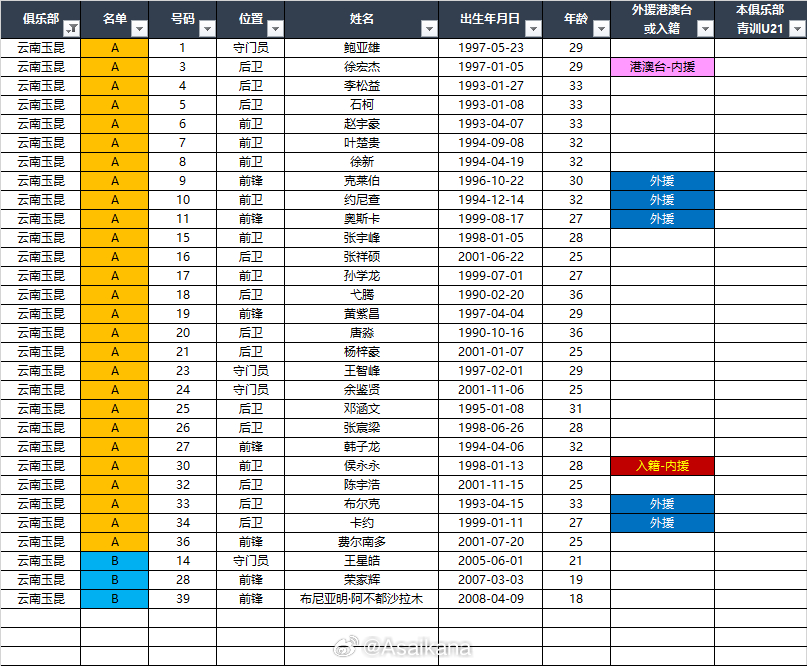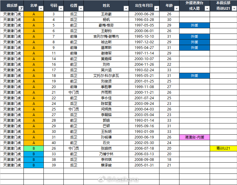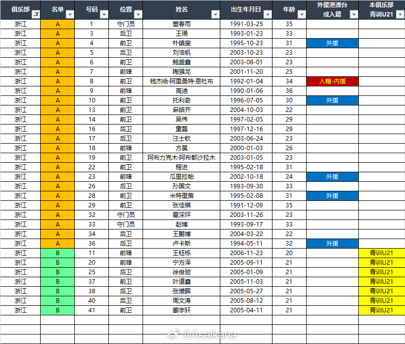 2026中超联赛各队报名名单(季前)*自整理,青训U21的标注不一定准确,仅供参