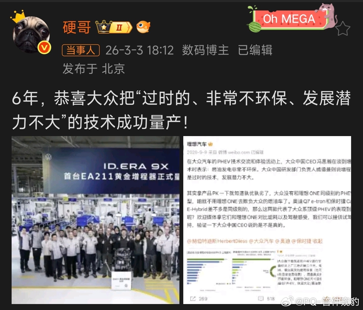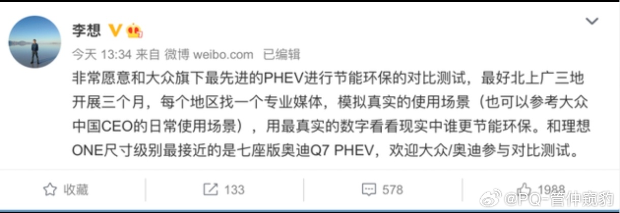 大众回应理想高管暗讽硬哥说的没毛病!时间: 2020.9.8 地点: 成都媒体沟通会 人物: 冯思翰(Stephan Wöllenstein),时任大众集团中国区CEO、大众汽车品牌中国CEO 观点: 【译文】 从单车角度来说,增程电动车有一定的价值。但从整个国家和地球来看,则简直是胡说八道,是最糟糕的方案。 大众下定决心要不断降低碳排放,如果我们继续燃烧化石燃料,用石油发电,那就没必要做电动车了。 The extended‑range electric car is valuable in its own right, but from the point of view of the whole country and the planet, it’s nonsense, the worst possible solution. The ultimate goal of developing electric vehicles is to reduce carbon emissions, but if you’re burning fossil fuels to generate electricity, there’s no need to do that at all.