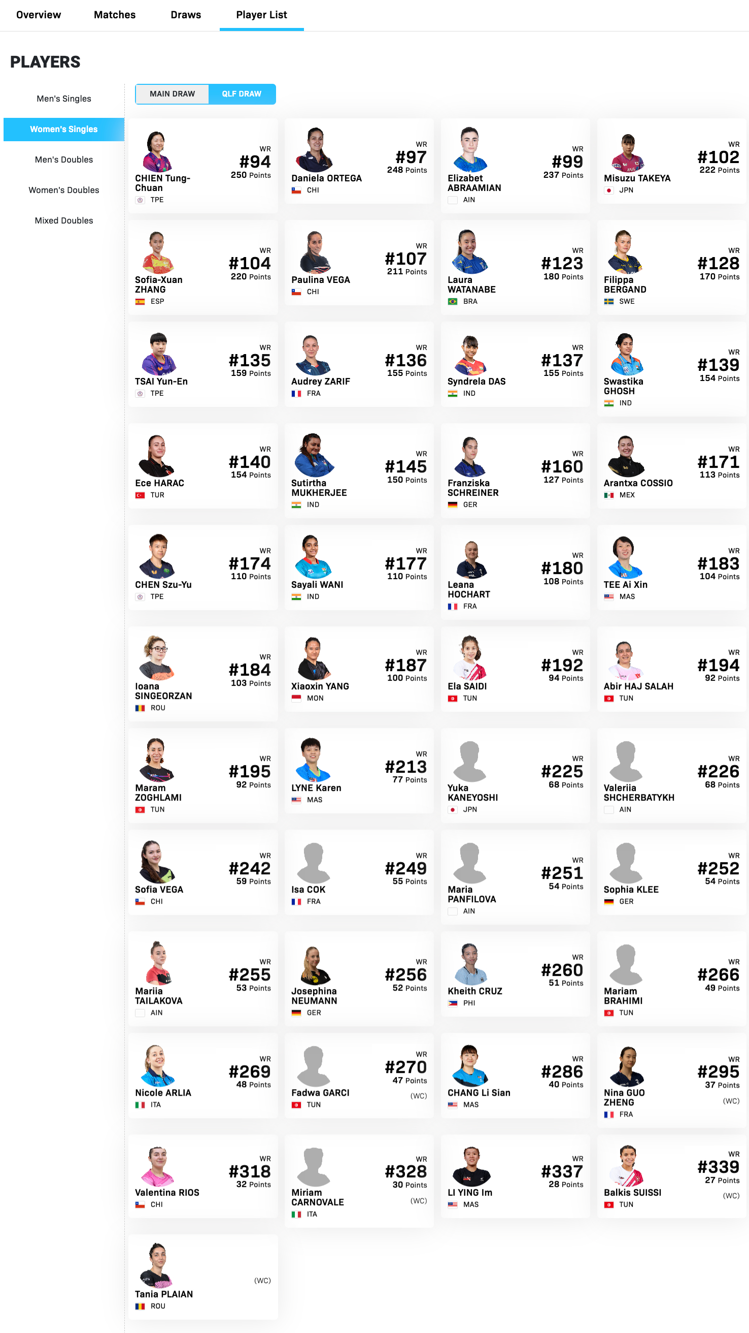 【资格赛】简彤娟(中国台北)、丹尼拉·奥特加🇨🇱、伊丽莎白·阿布拉米安(AIN)、竹谷美凉🇯🇵、张璇🇪🇸、波琳娜·维加🇨🇱、渡边·劳拉🇧🇷、菲利帕·博嘉德🇸🇪、蔡昀恩(中国台北)、奥黛丽·扎里夫🇫🇷、辛德瑞拉·达斯🇮🇳、斯维斯蒂卡·戈什🇮🇳、埃切·哈拉克🇹🇷、苏提尔塔·穆克吉🇮🇳、弗兰琪斯卡·施莱纳🇩🇪、阿兰特萨·科西奥·阿塞维斯 🇲🇽、陈思羽(中国台北)、萨亚利·瓦尼🇮🇳、莉安娜·霍查特🇫🇷、郑爱欣🇲🇾、伊万娜·辛格尔赞 🇷🇴、杨晓馨🇲🇨、埃拉·赛迪🇹🇳、阿比尔·哈吉·萨拉赫🇹🇳、马拉姆·佐格拉米🇹🇳、可人🇲🇾、兼吉优花🇯🇵、瓦莱里娅·舒切尔巴蒂赫(AIN)、索菲亚·维加🇨🇱、伊萨·萨克🇫🇷、玛丽亚·潘菲洛娃(AIN)、索菲亚·克利🇩🇪、玛丽亚·泰拉科娃(AIN)、约瑟芬娜·纽曼🇩🇪、凯斯·克鲁兹🇵🇭、玛丽亚姆·布拉希米🇹🇳、妮可·阿利亚🇮🇹、法德瓦·加尔西🇹🇳、郑丽贤🇲🇾、郭铮🇫🇷、瓦伦蒂娜·里奥斯🇨🇱、米里亚姆·卡诺瓦莱🇮🇹、严丽映🇲🇾、巴尔基斯·苏西🇹🇳、塔尼亚·普莱安🇷🇴