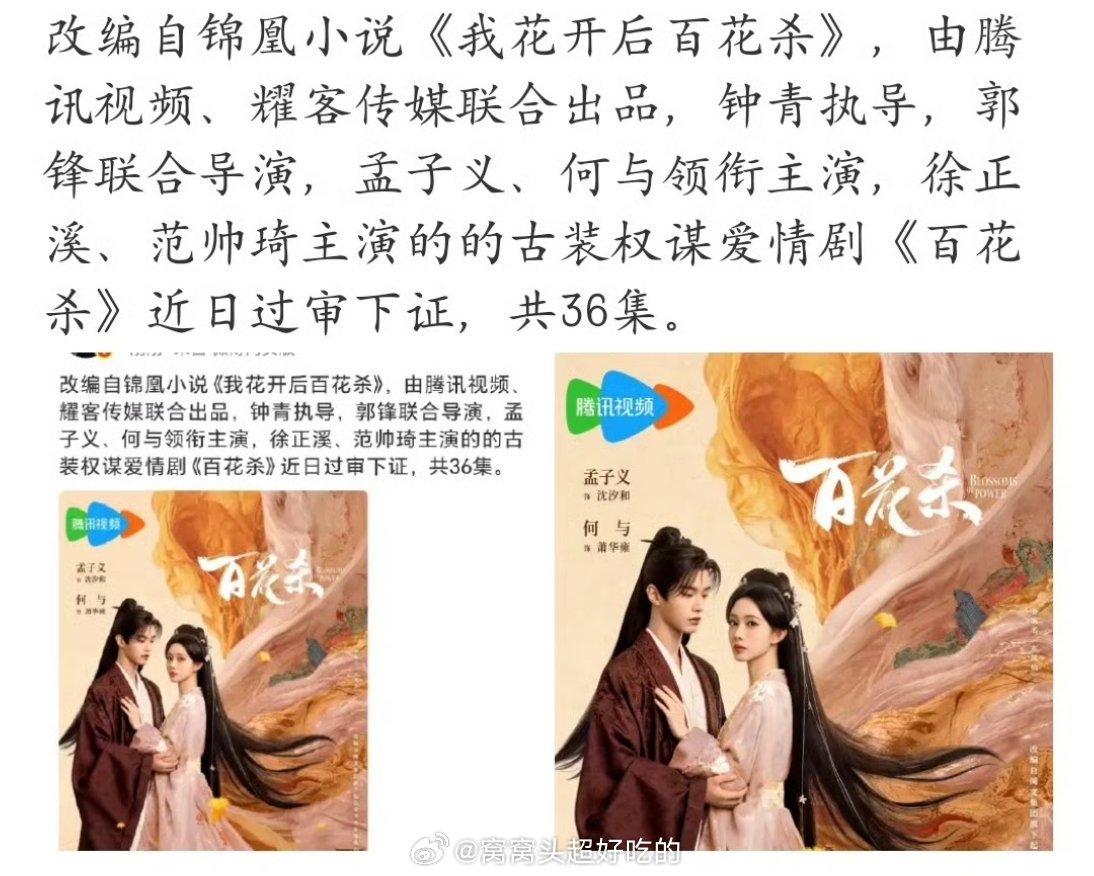 孟子义 何与主演的《百花杀》过审下证了共36集,即将播出!!这部剧有点期待,感觉