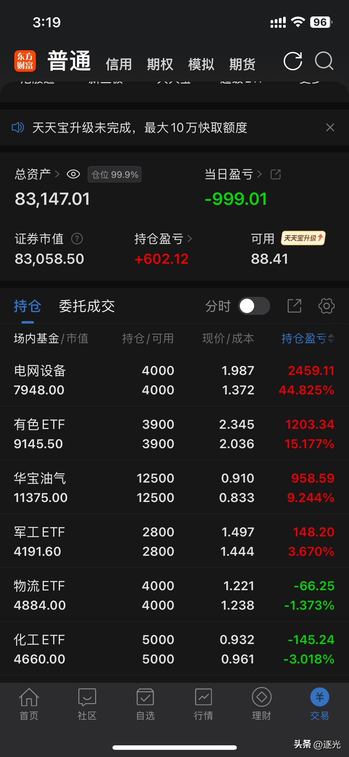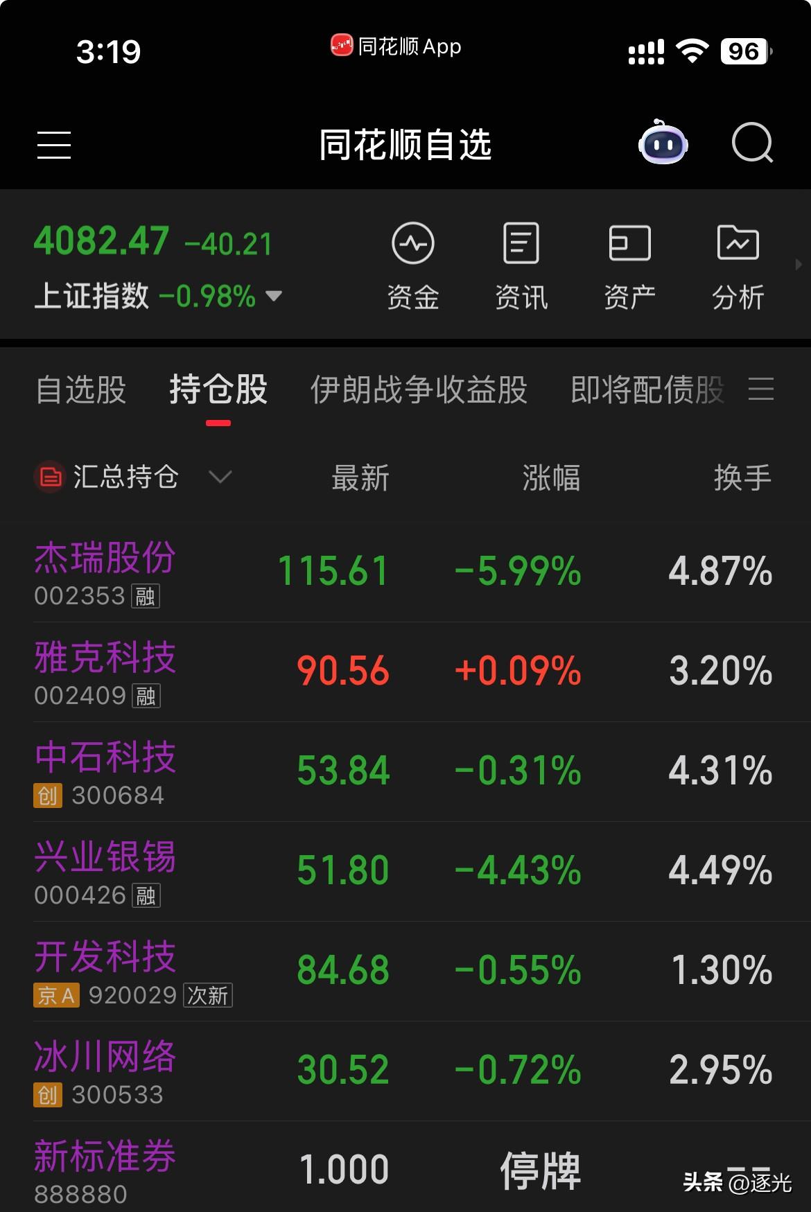 今天大盘受伊战及外围股市影响,没有太大起色。早盘卖出华胜和祥和,这两股盈亏相互抵消。下午购入昨天卖出的开发和冰川。另外购入雅克和中石,杰瑞。都是小仓位,整体仓位不高只有21%。ETF账户把剩下的资金都买了华宝油气,这个点已经不能减仓了,要逐步加仓,一旦反弹才能跟上减亏。今天继续亏2千。本月扭亏任重道远[捂脸],明天下跌继续加仓。