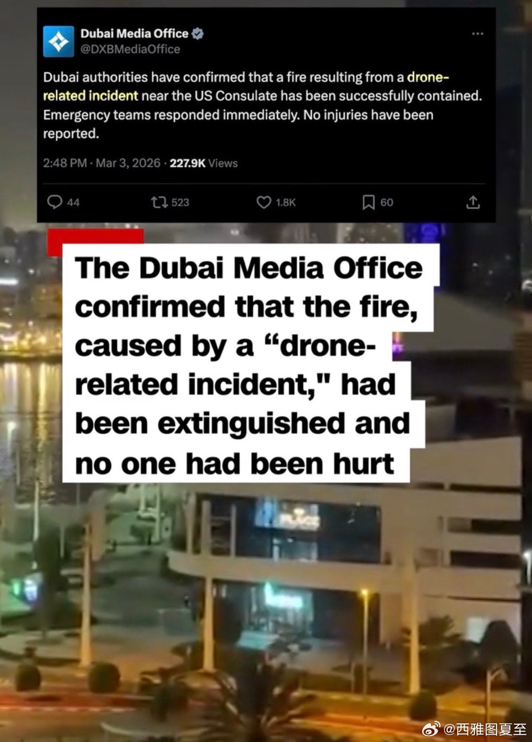 美国驻迪拜领事馆,附近的停车场,由于坠落的无人机,引发起火,被迅速扑灭,没有人员