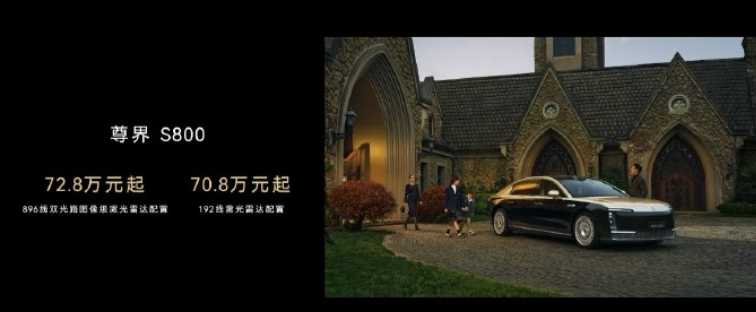 尊界 S800 搭载 896 线激光雷达卖 72.8 万元,比 192 线激光雷达贵 2 万元。