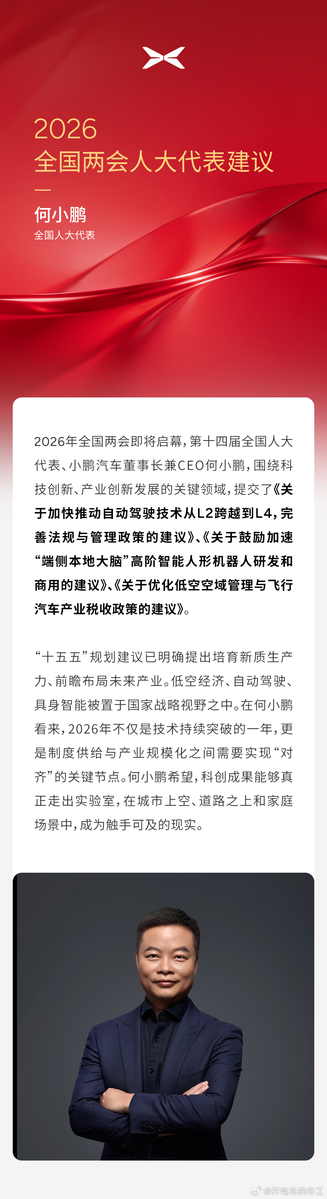 从智能汽车到机器人、飞行汽车,小鹏正在用物理AI打通未来出行全版图。作为消费者,真心期待政策加速,让中国智驾、中国智造领跑全球!何小鹏2026两会3条建议何小鹏建议推动L2跨越到L42026年全国两会