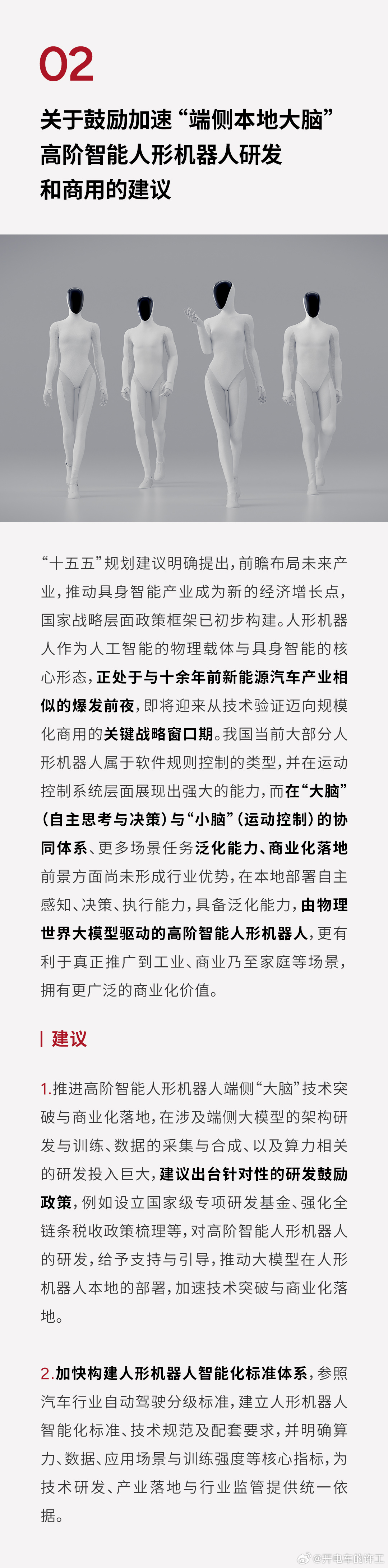 1、自动驾驶:跳过L3,直接L2跨L4建议明确L4注册与通行规则,放开C端无人驾驶试点,建立“人驾+机驾”双规则交通体系。把咱们L2的优势,直接变成L4时代的全球胜势,高阶智驾真的要走进普通人车里了。2、具身智能:人形机器人迎来爆发前夜推动“端侧本地大脑”研发,建国家级基金与智能分级标准。复用汽车供应链与AI基座,机器人不再是炫技玩具,要变成量产商用的新物种。3、低空经济:飞行汽车要从科幻变现实优化低空空域管理,明确飞行汽车税收与适航标准,给政策红利。小鹏汇天的飞行汽车,真的在加速走进生活。