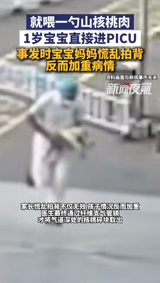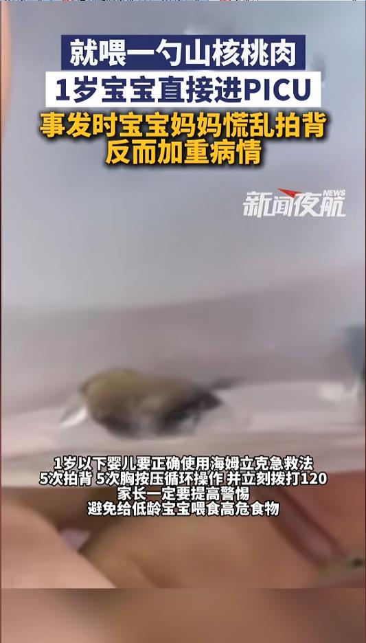“这下后悔了吧!”近日,浙江杭州,一位宝妈给自己只有一岁大的宝宝喂了一小勺山核桃肉,谁知道刚喂下去,宝宝就出现了应激反应,开始剧烈咳嗽。宝妈瞬间慌了,赶紧给宝宝拍背,没想到情况反而更严重了!网友:孩子这么小怎么能喂这些东西呢? 宝宝的各项消化器官都还没有发育完全,在喂食的时候一定要注意。前期以奶为主,渐渐地可以增加些正餐,但是要注意打碎,千万不能喂一些孩子咬不动的食物。 据媒体3月4日报道,事发当日,女子给自己的宝宝喂了一小勺山核桃肉,没想到直接把他呛到了。宝宝开始剧烈的咳嗽,还伴有呼吸困难,脸色也开始发紫。 女子吓坏了,赶紧给宝宝拍背,心想着能自己吐出来。没想到拍完一点用没有,宝宝的状况更加严重了,她赶紧把宝宝送进了医院。 医生发现宝宝的情况十分危险,立刻安排转进PICU进行抢救。检查中发现,核桃碎被呛进了宝宝的呼吸道。医生通过纤维支气管镜,最终在宝宝的气管深处,将核桃肉的碎屑取了出来。 事后,医生对女子进行了批评教育。孩子太小,自己咀嚼差,气管也很细。坚果、果冻这些食物对孩子来说充满了危险,极易造成气道异物。 同时,当宝宝被异物呛到后,一定不要盲目敲背,应当及时拨打急救电话。等待就医的过程中,可以使用海姆立克急救法。5次拍背,5次胸腔按压,依次循环往复。 网友看后表示,急救法用的再正确,那也是事后补救,防患于未然才是王道! 信息来源:《3月4日,就喂一勺山核桃肉,1岁宝宝直接进PICU,事发时宝宝妈妈慌乱拍背,反而加重病情。》新闻夜航