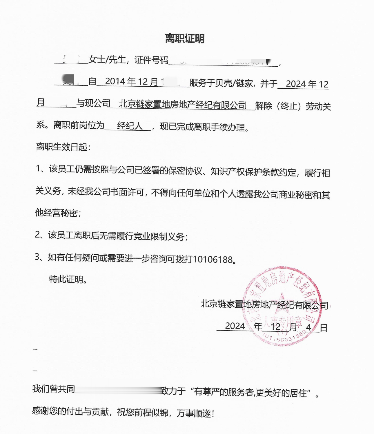 (图为北京链家为该员工开具的全段离职证明)