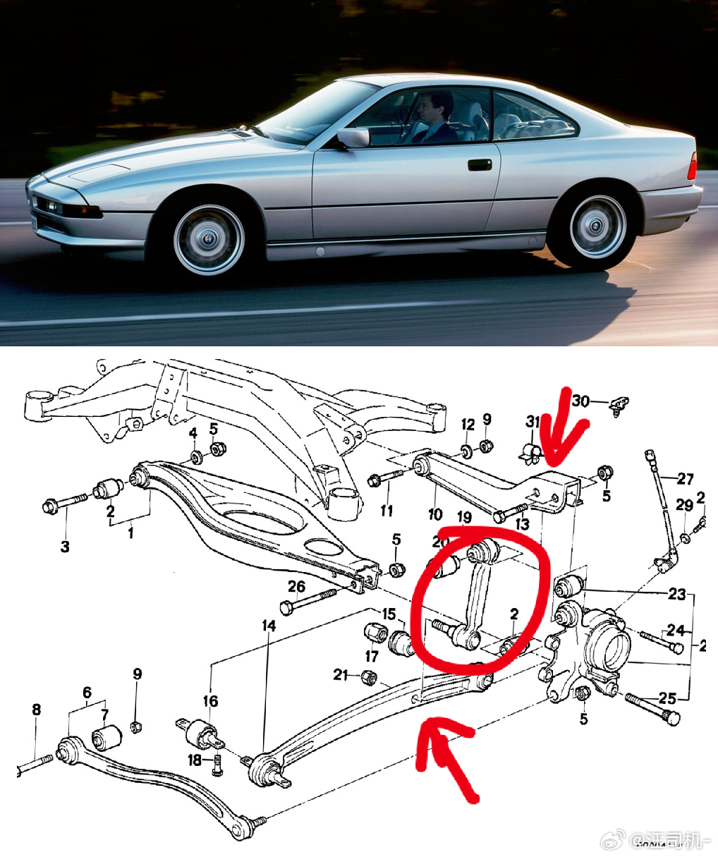 【历史回顾】太阳底下无新事,即便通用这款新型悬架的设计很别致,但依旧能在百年汽车史上找到个姊妹款。比如90年代的宝马E31 850,其后悬架就采用了完全一致的解耦控制思路,只不过它抵抗制动力力矩的吊杆,装在camber link与radius arm之间。
