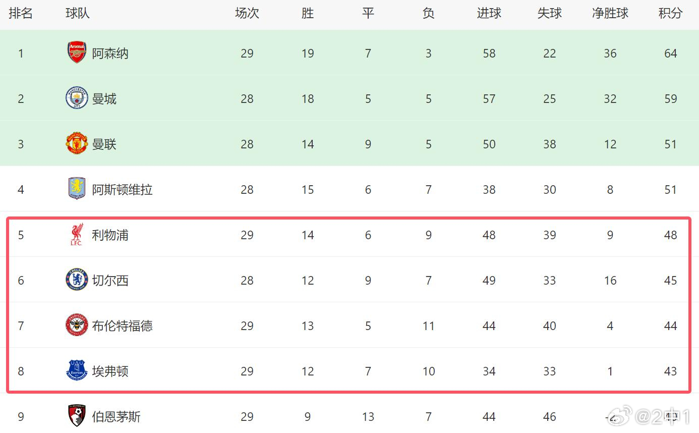 目前从第五名利物浦到第八名埃弗顿,四支球队积分差距仅为5分。埃弗顿与布伦特福德的强势表现,正在改变原本相对清晰的第一梯队格局。