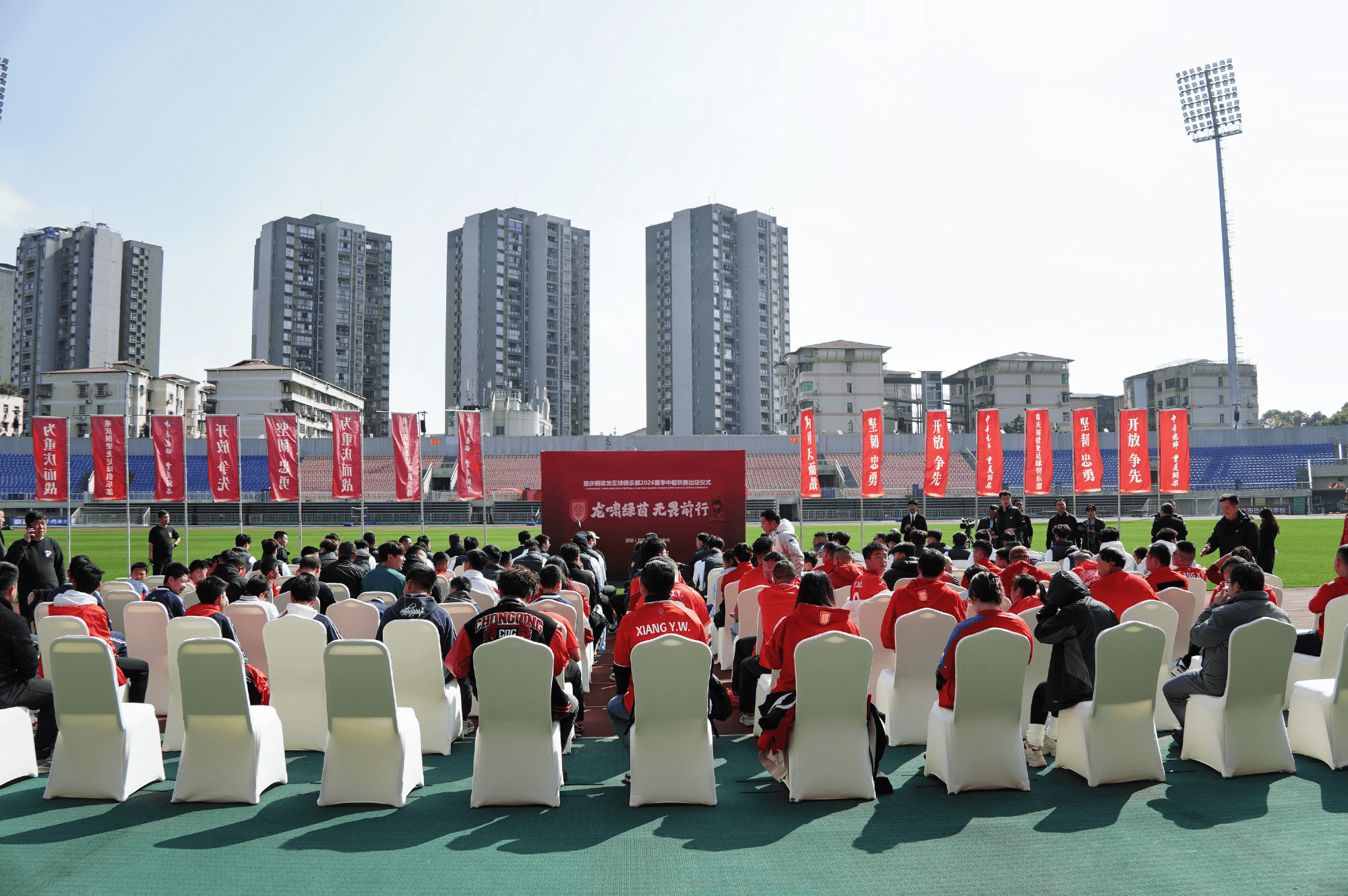仪式在“重庆雄起”的齐声呐喊、共送祝福中圆满落幕。战旗猎猎,号角吹响;初心如磐,无畏前行。2026赛季,重庆铜梁龙足球俱乐部将承载着市区两级部门的关心支持、全体球迷的殷切期盼,以昂扬姿态驰骋中超赛场,以拼搏诠释担当,以奋斗书写荣光,奋力续写重庆足球的崭新篇章,为推动中国足球事业发展贡献重庆力量!