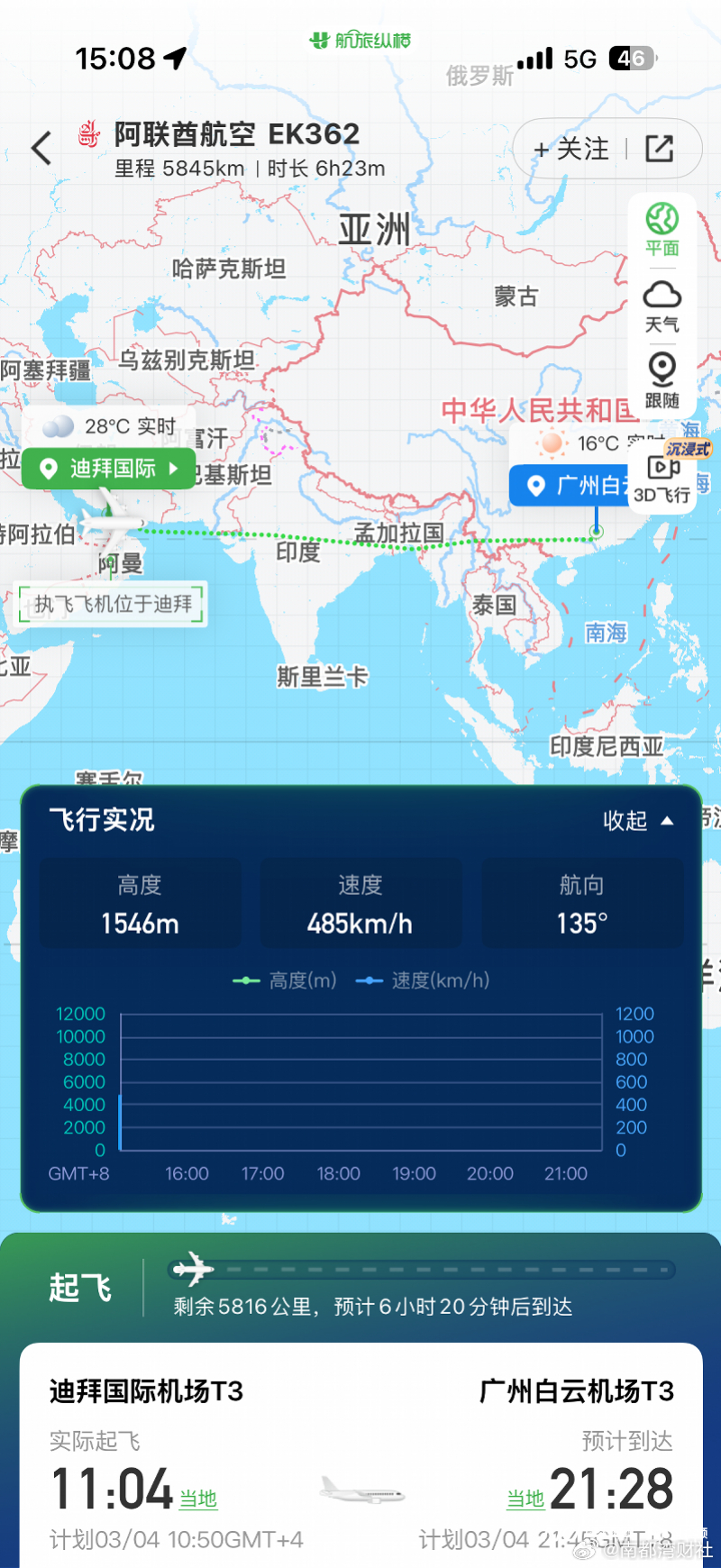【复航!迪拜机场恢复运营后第一架飞机从迪拜飞往广州白云机场】#迪拜至广州复航# 南都N视频记者同时从航旅纵横和飞常准APP获悉,据航班动态显示,3月4日,当地时间3月4日11:04,阿联酋航空 EK362(迪拜-广州)航班已从迪拜国际机场起飞,预计北京时间3月4日21:18到达广州白云机场。飞行时长约为6小时14分钟,执飞机型为波音777-300ER(宽体机)。这是自迪拜机场重新恢复运营以来第一架飞往中国境内的航班。