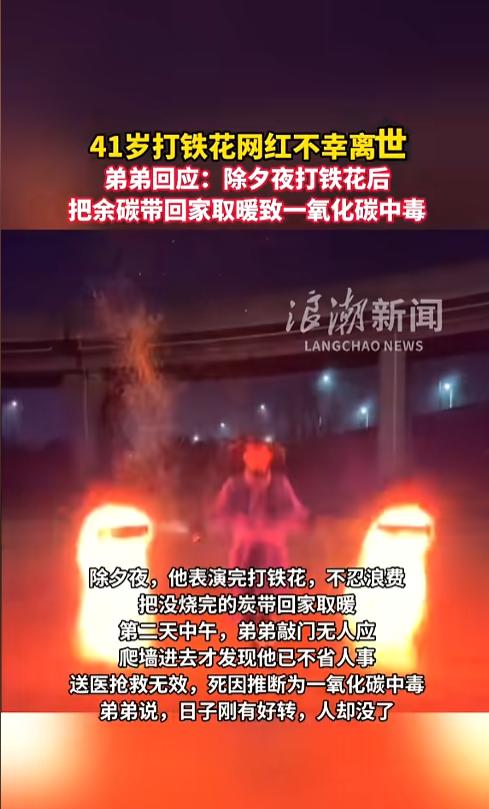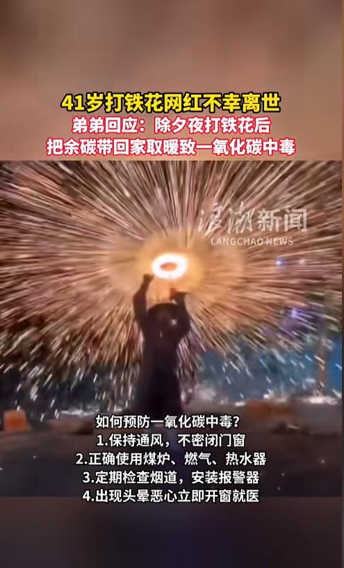 “悲剧还是发生了!”近日,山东菏泽,一名41岁打铁花网红因一氧化碳中毒不幸离世。该网红表演完打铁花后,因不忍浪费,便将剩下没烧完的炭带回家中取暖,没想到却发生了中毒事件,被发现时已不省人事,只留下了两个孩子。网友:厄运专挑苦命人! 每到冬季,因取暖导致的一氧化碳中毒事件层出不穷,无数人因此失去了生命。 据媒体3月4日报道,该网红是两个女儿的单亲爸爸,为了抚养孩子,他看到网上打铁花火了,便自学了电钻打铁花和火壶表演。 事发前一日,正值除夕夜,他表演完打火花后,看见还有些没烧完的炭,不忍心浪费了,就带回了家中,用来取暖。 事发当日中午,他的弟弟来家中找他,敲了半天门没人应,手机也联系不上。弟弟担心出了什么事,从外面爬墙进去,发现他已经不省人事,赶紧送了医院。 经过抢救,该网红还是没能醒过来,医生推测为一氧化碳中毒。可怜两个女儿,变得孤苦伶仃。 专业人士介绍,一氧化碳是一种有毒气体,它无色无味,也没有刺激性,让人很难发现。它主要由木柴煤炭等燃烧不充分产生。人体一旦吸入,就会导致头晕等中毒症状。尤其是夜间熟睡时,极易导致中毒死亡。 提醒大家,冬季,尽量不要在屋内使用炉子进行取暖。必须要用的情况下,一定不能将门窗紧闭,必须要保证屋内的通风!有条件的可以买一个报警器! 信息来源:《41岁打铁花网红不幸离世,弟弟回应:除夕夜打铁花后,把余碳带回家取暖致一氧化碳中毒》浪潮新闻
