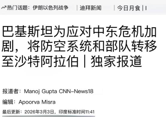 巴基斯坦要帮沙特打伊朗?巴铁外长表达了一个隐晦的威胁 3 月 3 日,巴铁副总理兼外交部长达尔公开表示。他已经向伊朗方面传达了一个信息。巴基斯坦与沙特保持着一项共同防御的军事协议。 达尔的这番表态没有使用激烈措辞。他的语气保持着外交场合的平和。他的面部表情也没有展现出对抗姿态。 这句话的分量却足以震动整个中东地区。巴基斯坦官方用最温和的表述。他传递出最清晰的安全红线。 这份共同防御协议并非临时拼凑的条款。巴基斯坦与沙特在 2025 年 9 月 17 日正式签署这份协议。协议的核心内容有着明确界定。任何针对其中一国的武装攻击。都会被视为对两个国家的共同侵略。 协议的签署有着清晰的现实背景。沙特长期面临来自外部的安全威胁。伊朗及其支持的地区武装力量。曾经多次对沙特境内的能源设施与军事目标发动袭击。 沙特曾经向美国寻求类似的共同安全保障。美国政府并未满足沙特的这一核心诉求。沙特只能转向长期友好的巴基斯坦。双方最终达成这份具有法律约束力的防务协定。 近期中东地区的局势持续升温。伊朗对约旦、科威特、阿联酋等多个海湾国家发动导弹与无人机袭击。沙特的领土安全也处在直接威胁之下。 沙特的民用机场、能源基地都面临被打击的风险。沙特官方已经联合多个阿拉伯国家发布抗议声明。沙特国内的安全防御等级已经全面提升。 达尔选择在这个时间节点公开提及协议。他不是在主动宣扬战争。他是在向伊朗发出明确的战略警告。伊朗的军事行动不能波及沙特的核心安全。 巴基斯坦不会对盟友的安全危机坐视不管。巴基斯坦也不会主动挑起与伊朗的正面冲突。巴基斯坦的核心诉求是遏制局势升级。巴基斯坦希望通过外交威慑化解直接冲突风险。 伊朗方面也对巴基斯坦的表态做出回应。伊朗官方要求沙特保证本国领土不被用于攻击伊朗。达尔已经将沙特的相关保证传达给伊朗方面。 伊朗的行动已经出现明显克制。伊朗近期的打击目标避开了沙特境内的关键设施。这说明伊朗已经接收到巴基斯坦传递的信号。 巴基斯坦与伊朗拥有漫长的边境线。两国在反恐、边境管控、经贸往来上存在长期合作。巴基斯坦不愿意与伊朗走向全面对立。 巴基斯坦国内同时面临着与阿富汗的边境冲突。巴基斯坦的军事与经济资源处在紧张状态。巴基斯坦没有多余的国力投入无端的地区战争。 巴基斯坦的外交行动展现出高度理性。他既坚守对沙特的盟友承诺。他也兼顾与伊朗的邻国关系。他更维护本国的核心安全与发展利益。 沙特对巴基斯坦的表态表示高度认可。沙特官方感谢巴基斯坦履行防务协定的承诺。沙特认为巴基斯坦的介入有效降低了本国的安全风险。 沙特依旧坚持通过外交途径解决分歧。沙特不愿意与伊朗爆发全面战争。沙特希望地区国家保持克制。沙特希望通过对话化解所有安全矛盾。 中东地区的稳定直接关系全球能源供应。海湾国家是全球石油与天然气的核心供应区。地区冲突的持续扩大会推高国际能源价格。全球经济的复苏进程会受到直接冲击。 国际社会纷纷呼吁相关各方保持克制。国际社会支持通过平等对话解决地区争端。国际社会反对任何加剧局势紧张的军事行动。 巴基斯坦此次的隐晦警告。他为失控的中东局势踩下一脚刹车。地区国家重新获得冷静评估局势的时间窗口。 巴基斯坦没有派出大规模军队进驻沙特。巴基斯坦没有发布任何宣战声明。巴基斯坦只用一份公开的协议提醒。他就实现了低成本的战略威慑。 这份协议的意义远超普通的军事合作。他标志着中东安全格局出现新变化。地区国家开始依靠多边盟友关系保障自身安全。 美国在中东地区的安全影响力持续下降。海湾国家不再把所有安全希望寄托在美国身上。海湾国家纷纷寻求多元的安全保障渠道。 巴基斯坦作为伊斯兰世界的重要国家。他凭借自身的军事实力与外交信誉。他成为地区安全平衡的关键力量。 伊朗需要重新评估当前的地区环境。伊朗不能忽视巴基斯坦的战略威慑能力。伊朗需要调整自身的军事行动节奏。伊朗需要避免同时与多个国家形成安全对立。 巴基斯坦始终坚持中立调解的立场。巴基斯坦愿意为沙特与伊朗搭建沟通平台,巴基斯坦希望两国通过和平方式化解分歧。巴基斯坦期盼中东地区早日恢复稳定。 达尔的这番公开表态。他不是战争的前奏。他是和平的提醒,巴基斯坦用最隐晦的外交语言。他发出了最有力的安全信号。中东所有相关国家都需要重视这份信号。各方都需要保持理性与克制。 地区和平与稳定符合所有国家的共同利益。任何军事冲突都会带来双输的结局。对话与协商才是解决分歧的唯一正确路径。