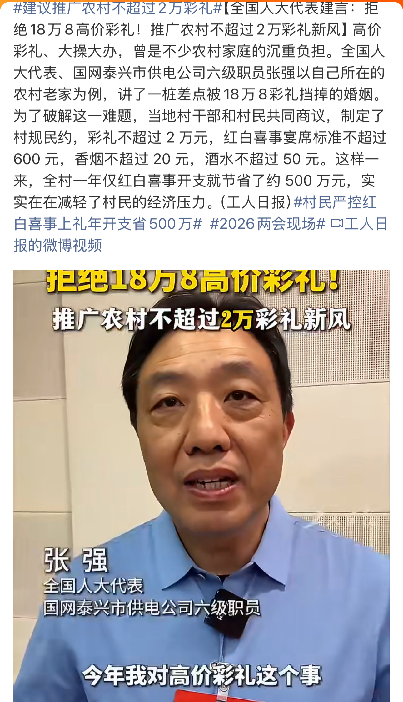→_→建议推广农村不超过2万彩礼→_→建议彩礼金额不超过6万元彩礼果然都是人大代表们关心的热门议题我还是那个观点,能不能不叫彩礼,也不给对方父母,而是由双方父母根据各自家庭条件,给新婚夫妇一笔家庭启动资金,用于双方家庭开销。热点观点 建议推广农村不超过2万彩礼