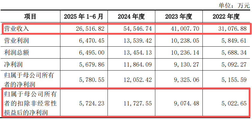 2022年至2025年1-6月,公司实现营业收入3.11亿元、4.10亿元、5.45亿元和2.65亿元;实现扣非后归母净利润分别为5,022.65万元、9,074.48万元、1.17亿元和5,724.23万元。