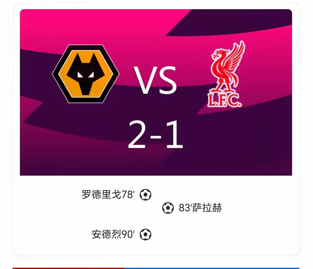 You'll Never Walk Alone 你永远不会独行。 利物浦的队歌,曾经让球迷热血澎湃,激情四射。 然而,主帅斯洛特,注定要独行了。 曾经大杀四方、让曼城上头的利物浦,曾经高位拼抢无数、铁血防守铜墙铁壁的利物浦,如今变成了这副怂样。 竟然被副班长狼队2:1斩于马下,创造了垫底球队击败卫冕冠军的新纪录。上一次还是在9年前。 同样悲催的,这还是利物浦在本赛季英超第5次被补时绝杀, 也是英超球队单赛季联赛被补时绝杀次数的新纪录。 利物浦,你忘了自己是英超冠军了吧。 上半场技术统计显示,利物浦完成了6次射门,无一建树。而是主场作战的狼队,没有完成一次射门。 熬过上半场的被动挨打之后,首先发难的反而是狼队。 第78分钟,狼队后场长传发动进攻,阿洛科达尔分球给到前插的罗德里戈·戈麦斯,罗德里戈·戈麦斯突入禁区,挑射攻破门将阿利松的十指关。 罗德里戈·戈麦斯连续两场进球。 此时此刻,弧顶位置是谁来把守? 凯尔凯兹、范戴克、科纳特去哪里了? 看元宵晚会直播去了? 五分钟后,狼队中圈附近传球失误,萨拉赫抢得皮球后,单挑狼队后防线,一条龙突入禁区破门得手。 然而,好日子总是短暂。 十分钟后的补时第四分钟,门将阿利松后场中路开大脚,直接被狼队抢断。特林达德得球后,在弧顶处拔脚怒射,皮球击中后方球员乔·戈麦斯的腿部,折射入网。 此时此刻,弧顶位置是谁来把守? 弧顶位置,成为了狼队获胜的“最佳伴手礼”。 曾几何时,科纳特“凡尔赛”,我和范迪克在一起,固若金汤。 今天咋弄滴,只剩下“金汤”了吧。 不服气的还有主帅斯洛特,如果我们能重来一次,或许柯蒂斯自己解围,阿利松把球踢向边路而不是中路。 如果我们以这种方式踢十次,我不认为我们会输十次。 可是,狼队用自己的努力,以下克上,将胜利写进了积分榜,而不是用嘴去辩解。 更有意思的是两个进球都是运动战进球,并没有目前英超热议的定位球。 狼队主帅爱德华兹在场边一路狂奔跳跃,甚至踢翻一个锥桶,一阵咳嗽,不知道是不是扯着那啥了。 狼队目前仅有16个积分,“刀下不斩无名之辈”,近期疯狂在豪门身上“打家劫舍”,在阿森纳(1)、曼联(3)、阿斯顿维拉(4)和利物浦(5)的身上抢了足足8分,是总积分的一半。 大家相信我们正走在正确的方向上。无论在第38轮比赛结束前发生什么,我们都会继续战斗。 我们已经惹怒了利物浦。 或许,世界足坛找到了英超球队为什么能在欧战“所向披靡”的原因了。 能在英超联赛“血与火”的洗礼中,摸爬滚打除出来的球队,绝非善类。 太能打了。 只能是“闲人闪开”。 第28轮刚被2:0锤了一顿的维拉主帅埃梅里,凑过来:哥,你也爽歪歪了? 利物浦本赛季各项赛事中,12场失利,输球率达到29%,这是球队自2014-2015赛季以来,单赛季最高的输球率。 不知道斯洛特是否还有心情,嘲讽克洛普时代的英超第三、第五名。 利物浦能否保住欧战资格,真的不好说啊。 主帅续约的事,多位高层或许正在“空悲切”。